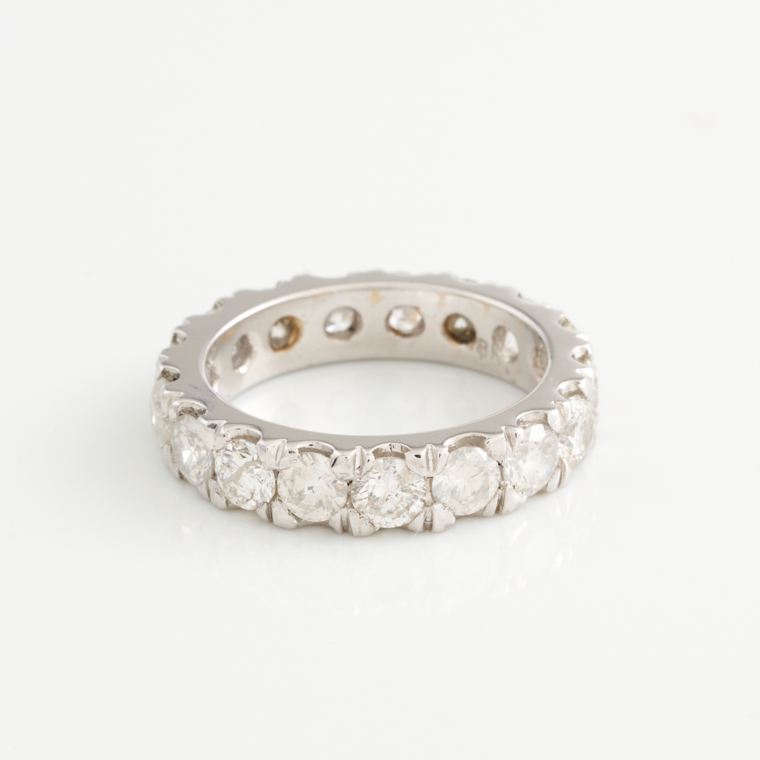 A DIAMOND ETERNITY RING IN 18CT WHITE GOLD, THE DIAMOND BRILLIANT CUT, G-I COLOUR AND S1-P1 IN CLARITY, TOTALLING 3.60CTS, SIZE M, TOTAL WEIGHT 5.9GMS, ACCOMPANIED BY A VALUATION