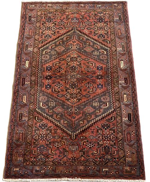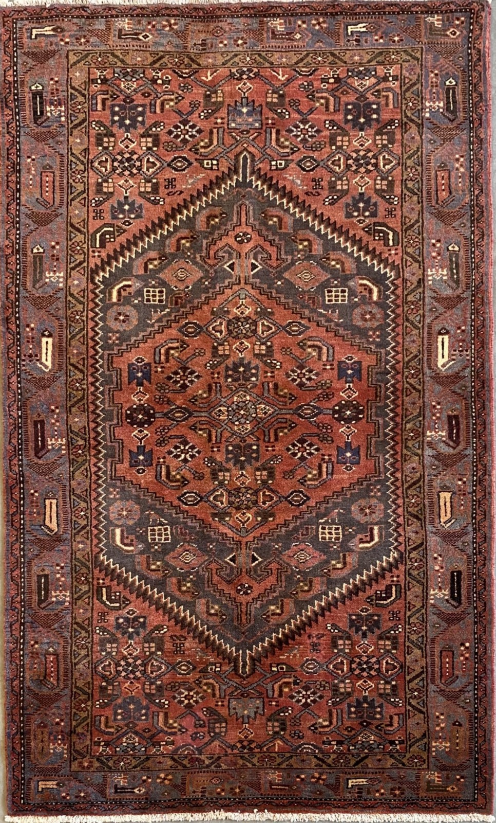 HAND-WOVEN VILLAGE WEAVE FROM THE HAMADAN REGION WITH TRIBAL DESIGN OF A HEXAGONAL MEDALLION CONTAINING HERATI MOTIFS IN A MADDER-TONED FIELD OF BOLD HERATI MAHI PATTERNS.
