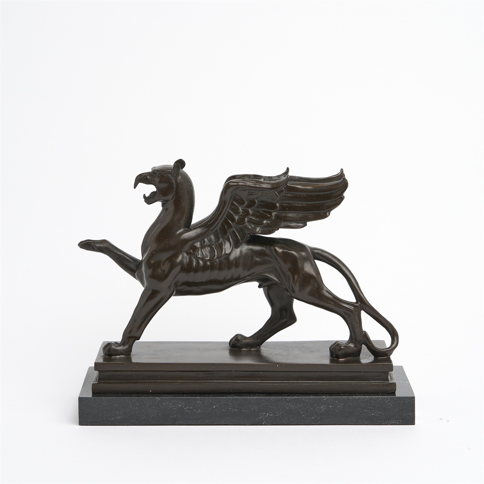 A BRONZE GRIFFIN MOUNTED ON A BLACK MARBLE BASE L.30CM