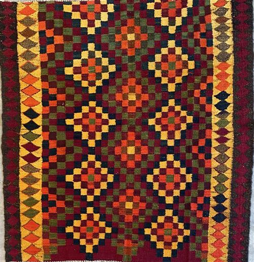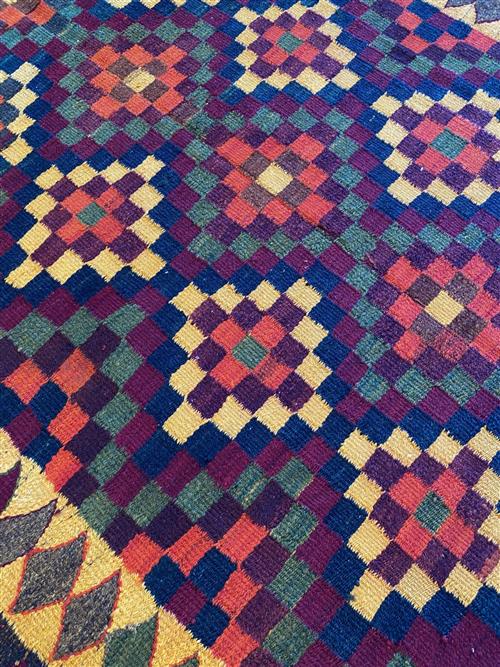 HAND WOVEN TRIBAL WEAVE FROM THE FARS PROVINCE WITH ALL-OVER COLOURFUL DIAMOND-SHAPED PATTERNS.