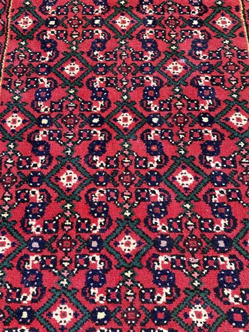 HAND-KNOTTED VILLAGE WEAVE FROM THE HAMADAN PROVINCE WITH TRIBAL DESIGN OF ALL-OVER FLORAL HERATI MAHI PATTERNS IN A RED FIELD. SCROLL-PATTERNED BORDER.