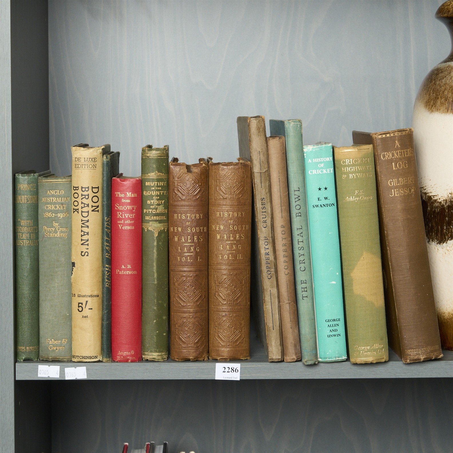 A SHELF OF BOOKS PERTAINING TO AUSTRALIANA AND CRICKET