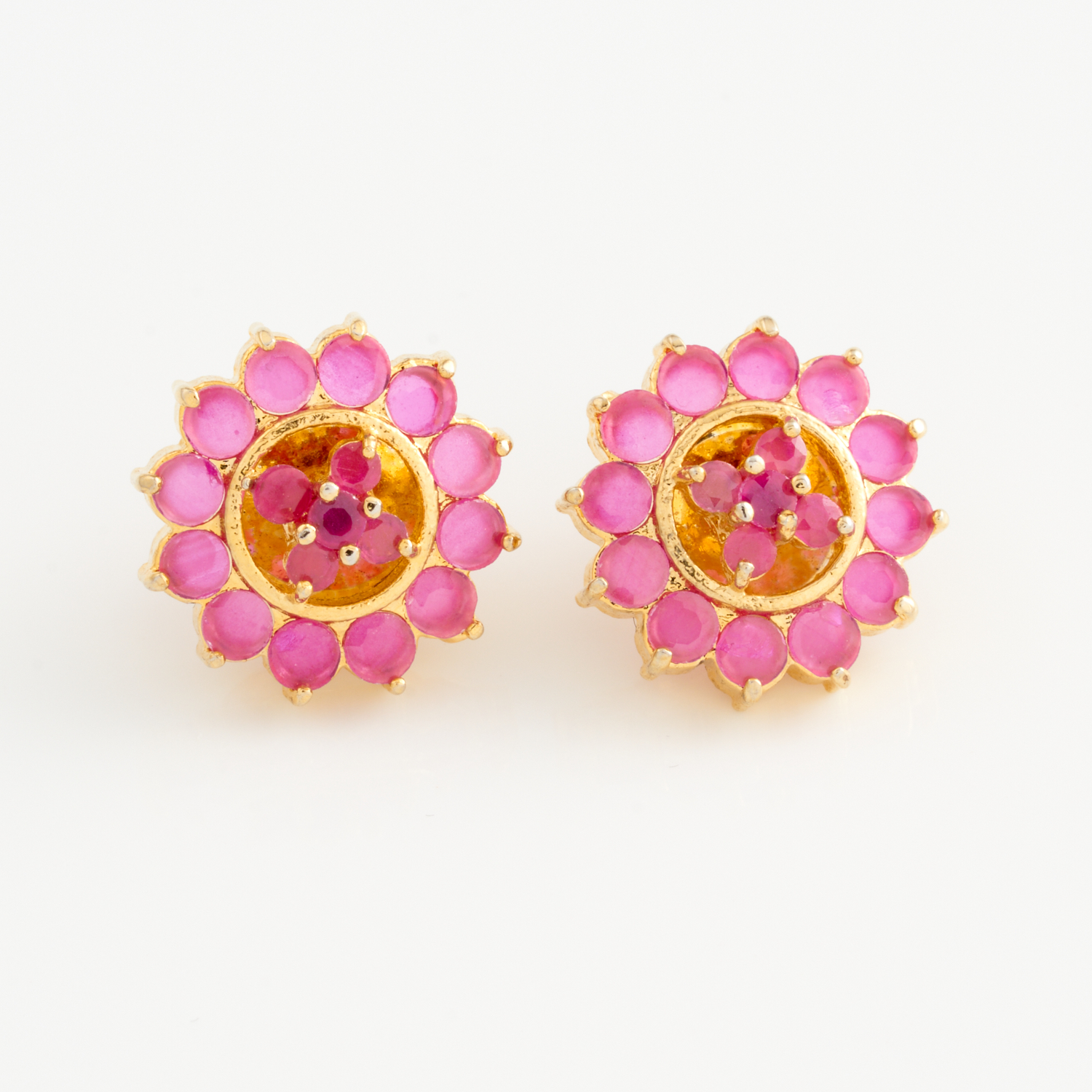 A PAIR OF PINK SAPPHIRE FLOWER EARRINGS IN SILVER GILT TO POST AND DISC FITTINGS, 16MM DIAMETER