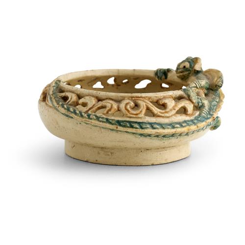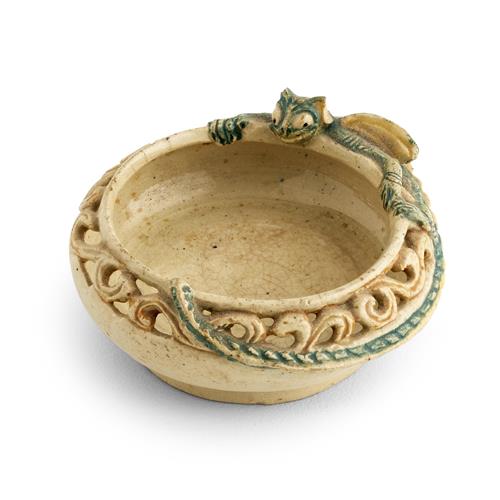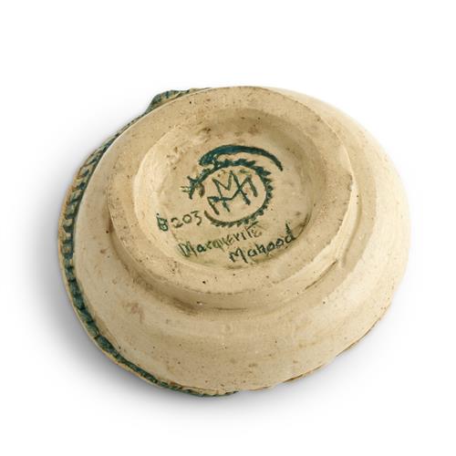 Of shallow circular shape on a raised foot, with a stylised pierced rim and applied with figure of a dragon, painted and incised signature 'Marguerite Mahood', with monogram and numbered 'B 203' underside