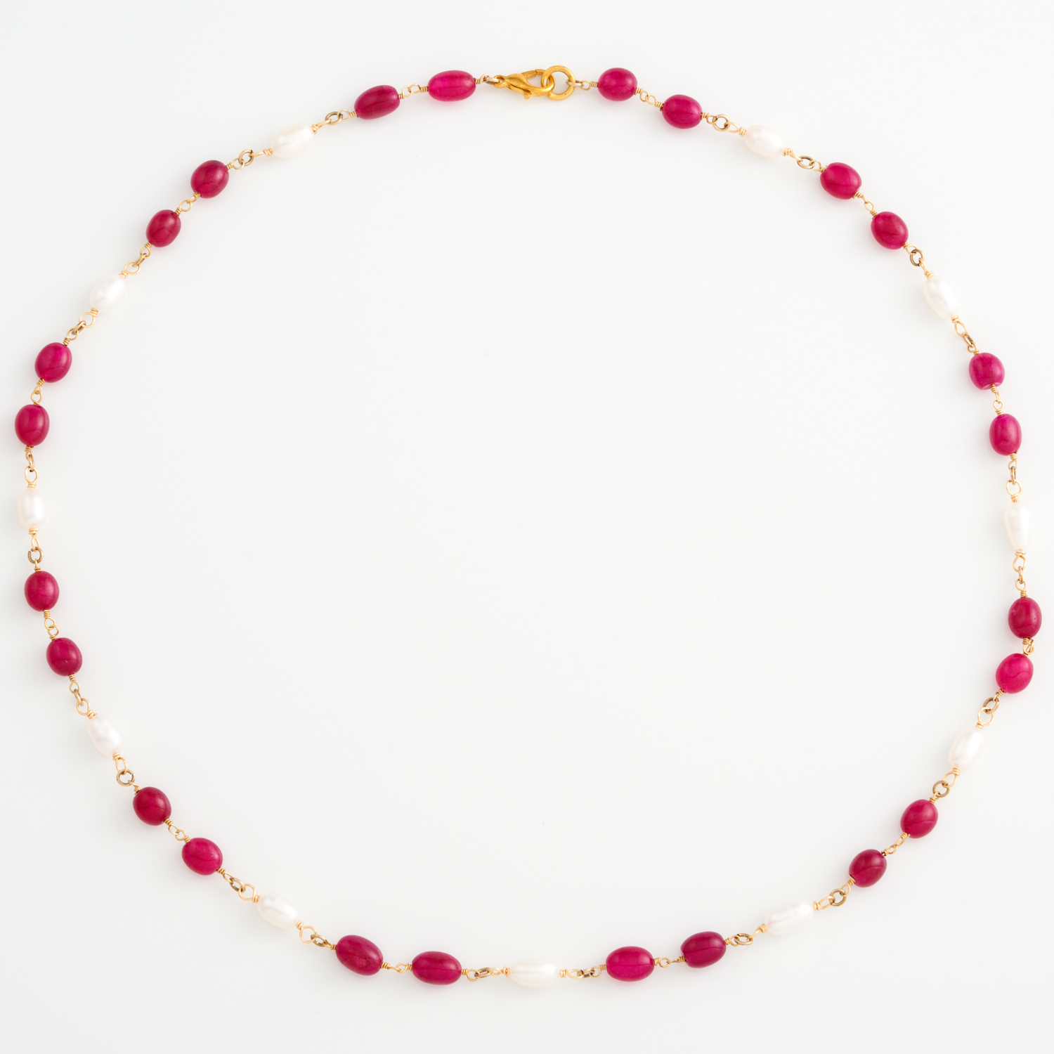 A DYED RUBY BEAD AND PEARL NECKLACE IN SILVER GILT, 520MM
