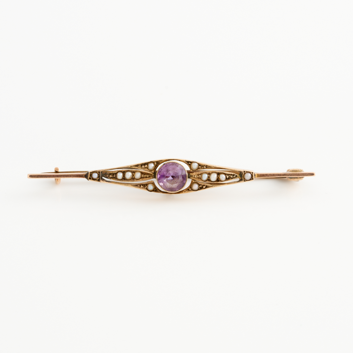 AN AMETHYST AND SEED PEARL VINTAGE BAR BROOCH IN 9CT GOLD, 55 X 8MM, TOTAL WEIGHT 2.10GMS