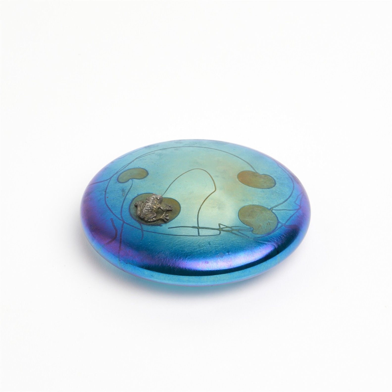 A J. MITCHFIELD IRIDESCENT GLASS PAPERWEIGHT WITH CAST METAL FROG ON LILIES DIA.11CM
