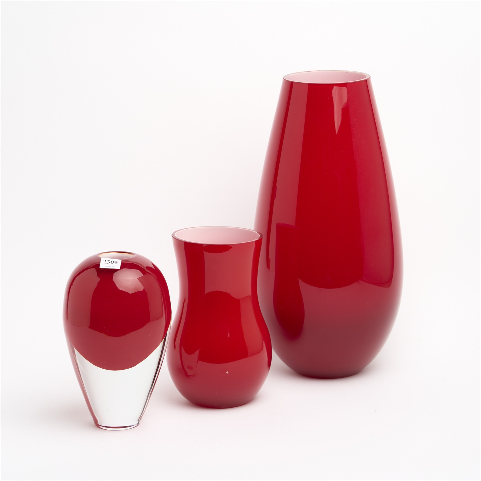THREE CONTEMPORARY RED CASED GLASS VASES H.42CM (TALLEST)