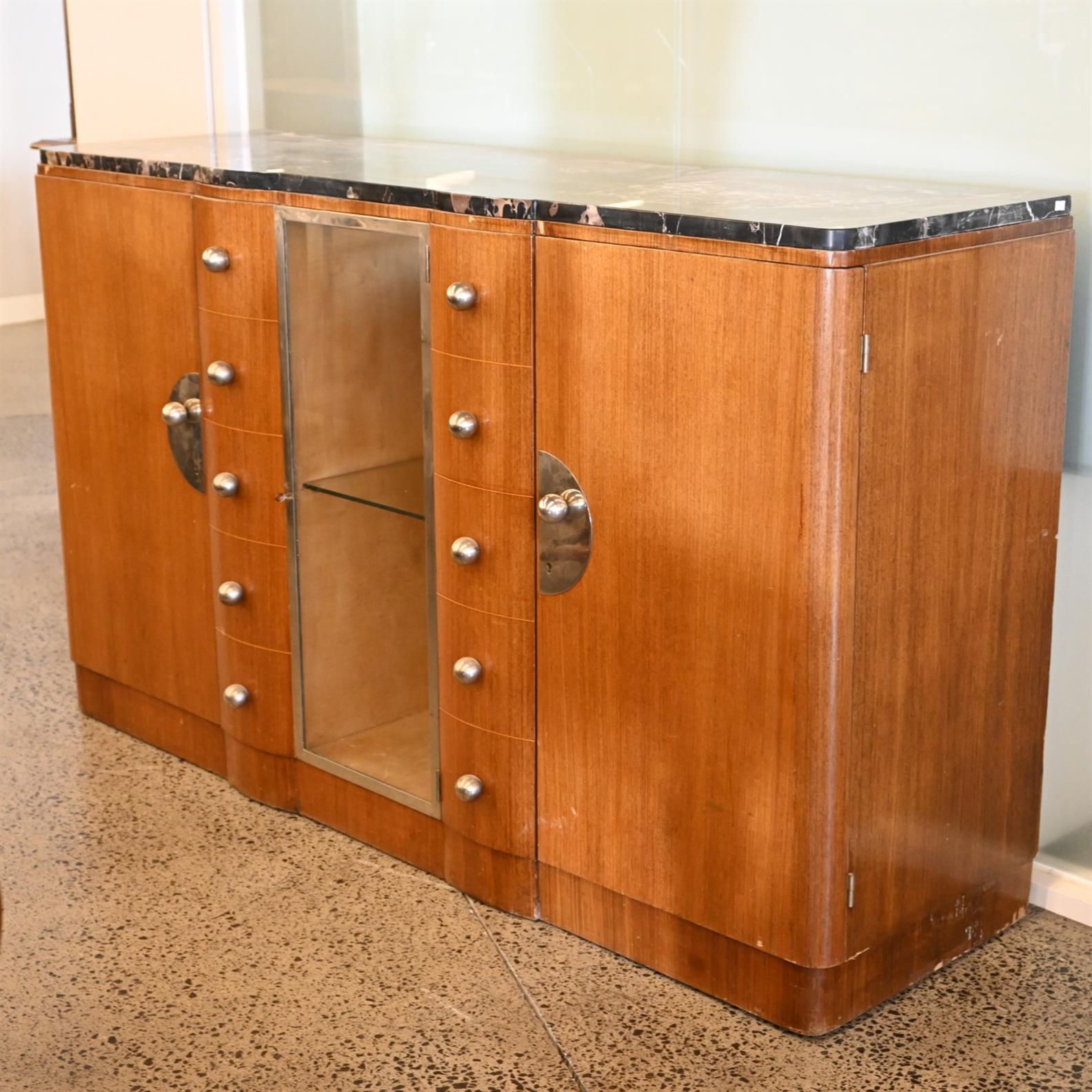 A FRENCH ART DECO SIDEBOARD WITH PORTORO MARBLE TOP (A/F) (103CM H X 173CM W X 53CM D)