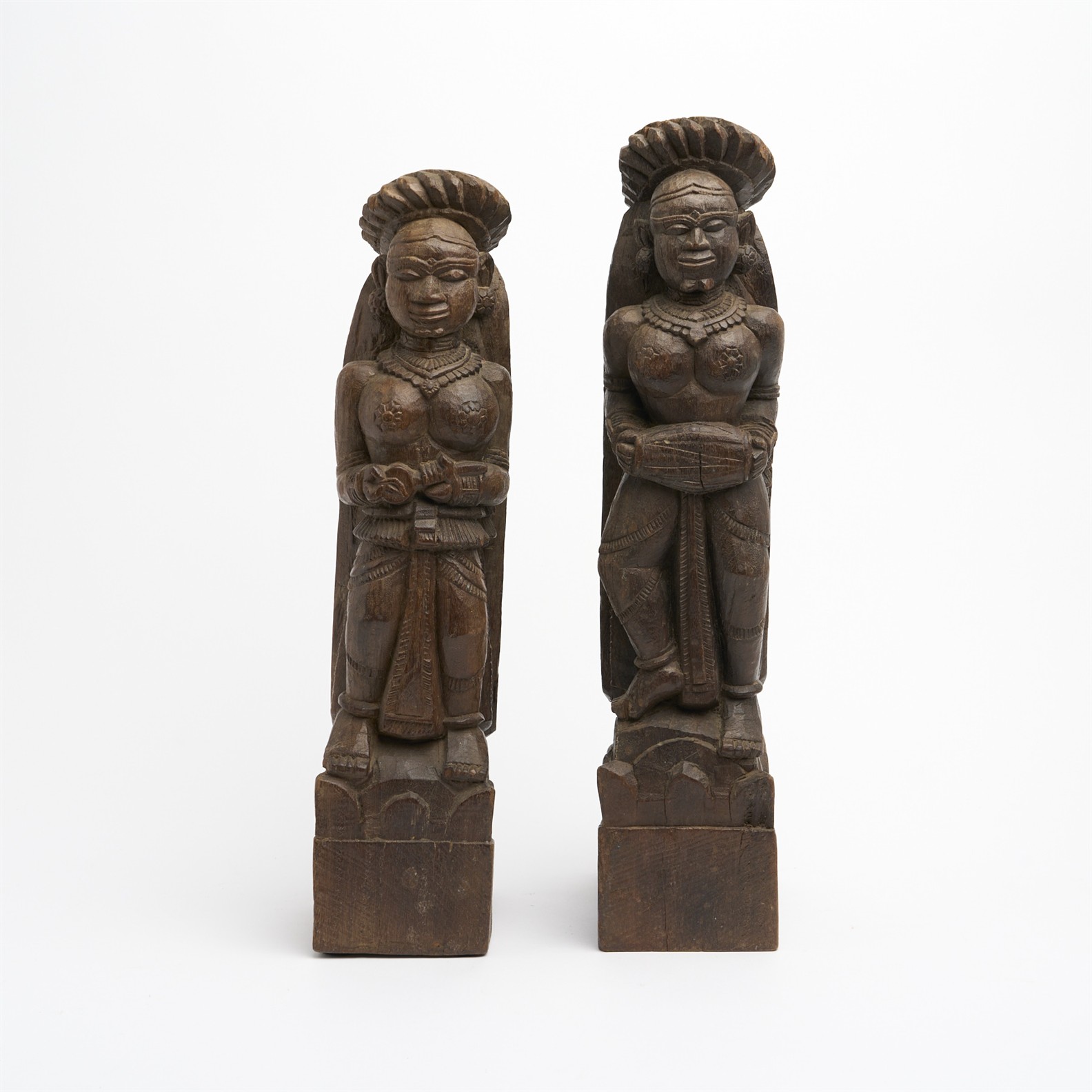 A PAIR OF SOUTH INDIAN HEAVY CARVED HARDWOOD FEMALE FIGURES (PROBABLY ARCHITECTURAL FIXTURES) H.51CM
