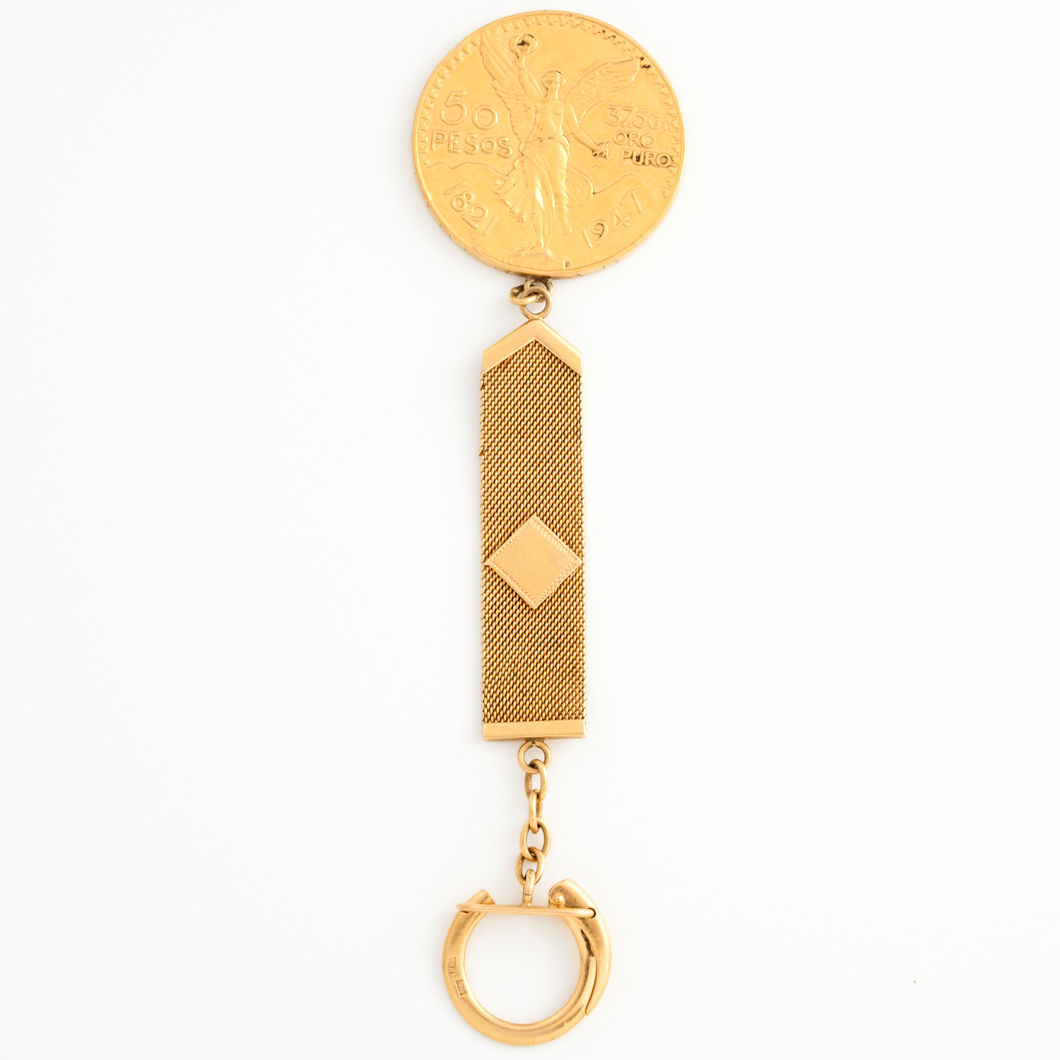 A 50 PESOS COIN IN 0.900 PURITY GOLD TO A MESH MEDAL RIBBON AND CLASP IN 18CT GOLD, 35 X 142 MM, TOTAL WEIGHT 55.68 GMS