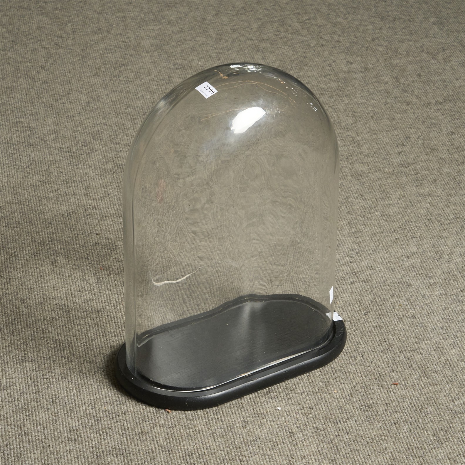 A LARGE DOME-SHAPED GLASS COVER ON EBONISED BASE (ILL FITTED) H.41CM