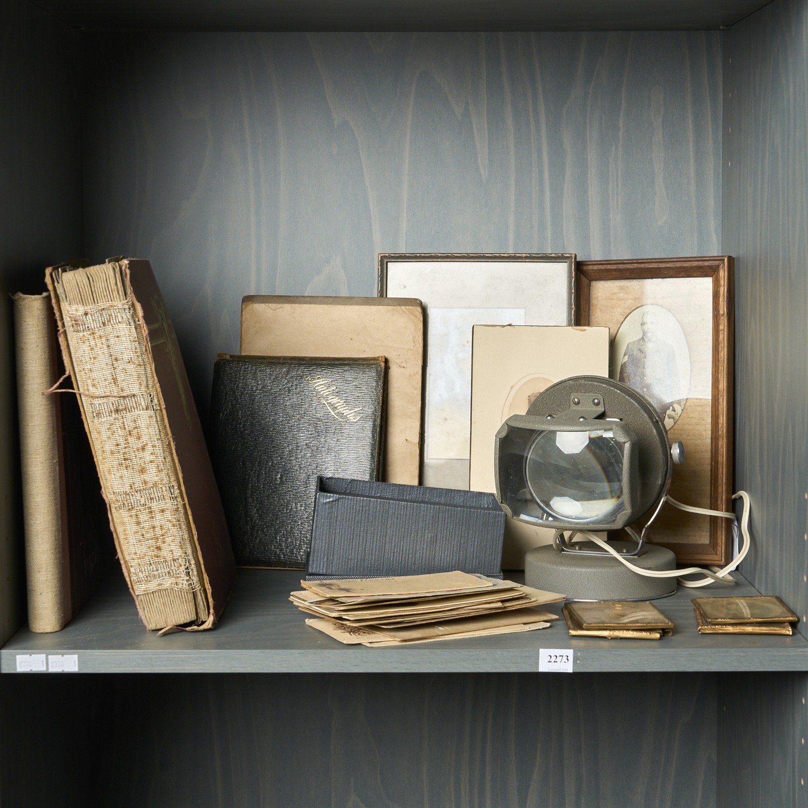 A COLLECTION OF PHOTOGRAPHIC AND HISTORICAL EPHEMERA INCLUDING TWO ALBUMS FILLED WITH PHOTOS AND POSTCARDS, AN AUTOGRAPH BOOK, A COLLECTION OF PHOTOS OF AUSTRALIAN COUNTRY TOWN LANDMARKS, A NUMBER OF FRAMED PHOTOS INCLUDING DAGUERROTYPES, AND A FILM PROJECTOR (A/F)