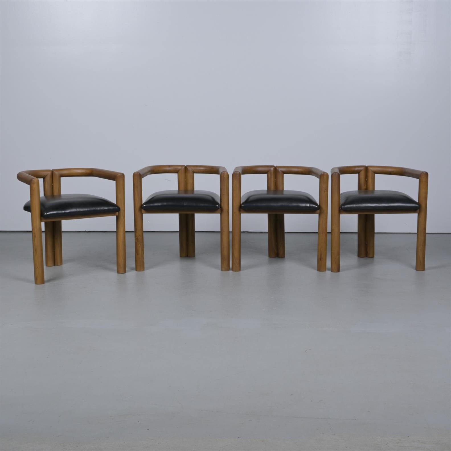 A SET OF FOUR CONTEMPORARY TEAK AND LEATHER UPHOLSTERED DINING CHAIRS (66CM H X 62CM W X 54CM D)