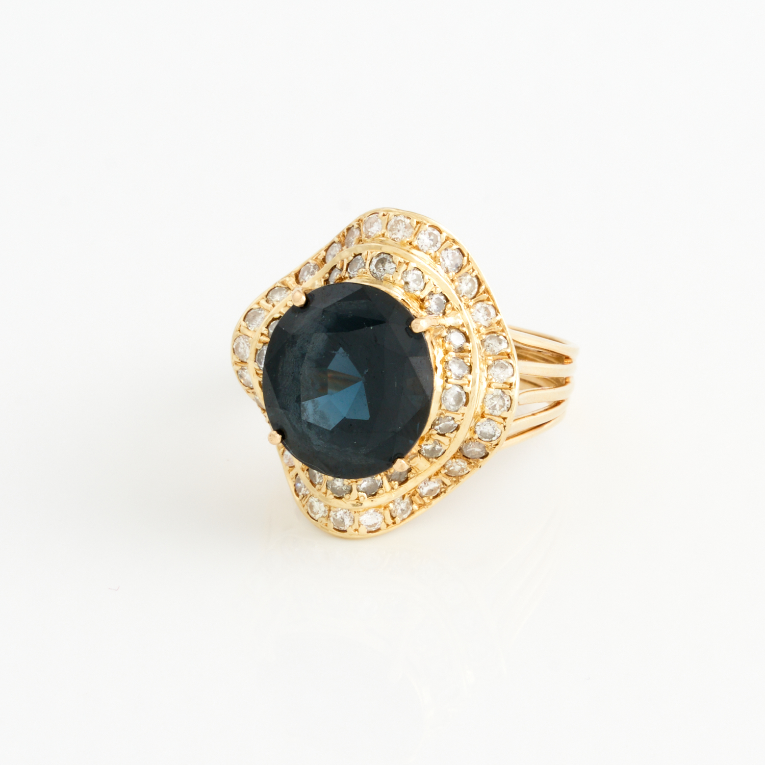 A SAPPHIRE RING IN 18CT GOLD WITH UNDULATING DIAMOND SET SURROUND, SIZE P, TOTAL WEIGHT 8.54GMS