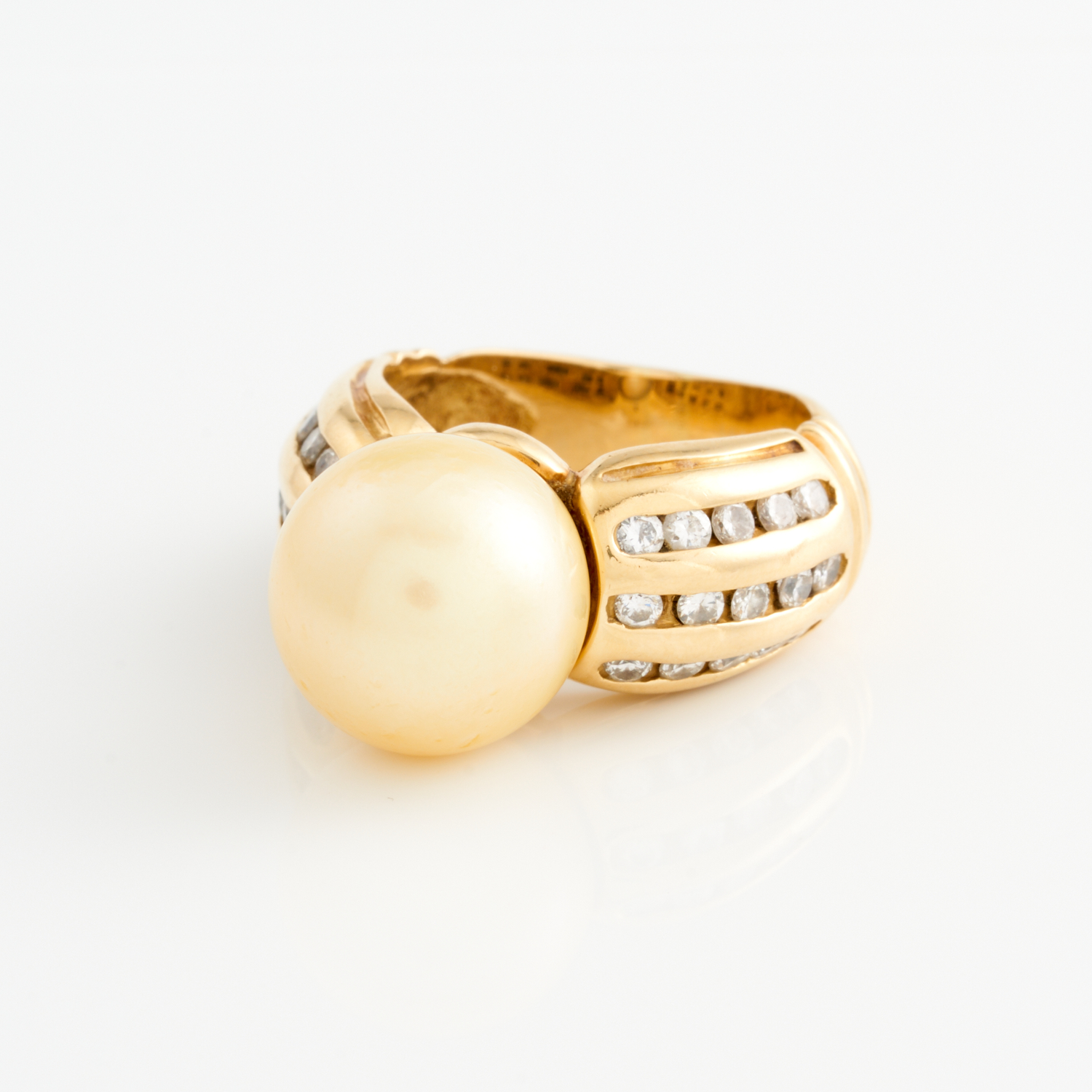 A GOLDEN SOUTH SEA PEARL AND DIAMOND RING IN 18CT GOLD, SIZE N, TOTAL WEIGHT 15.87GMS