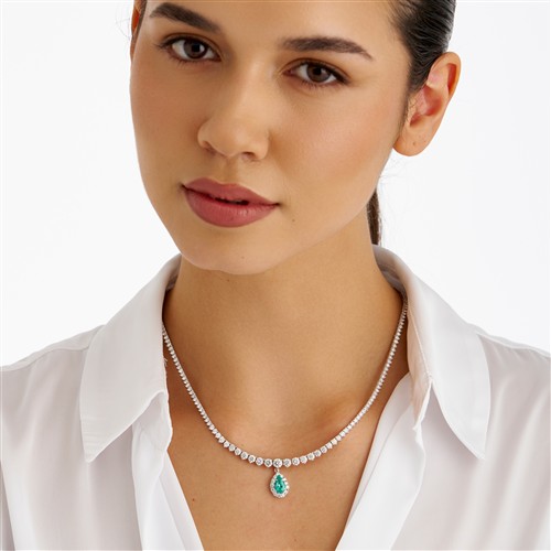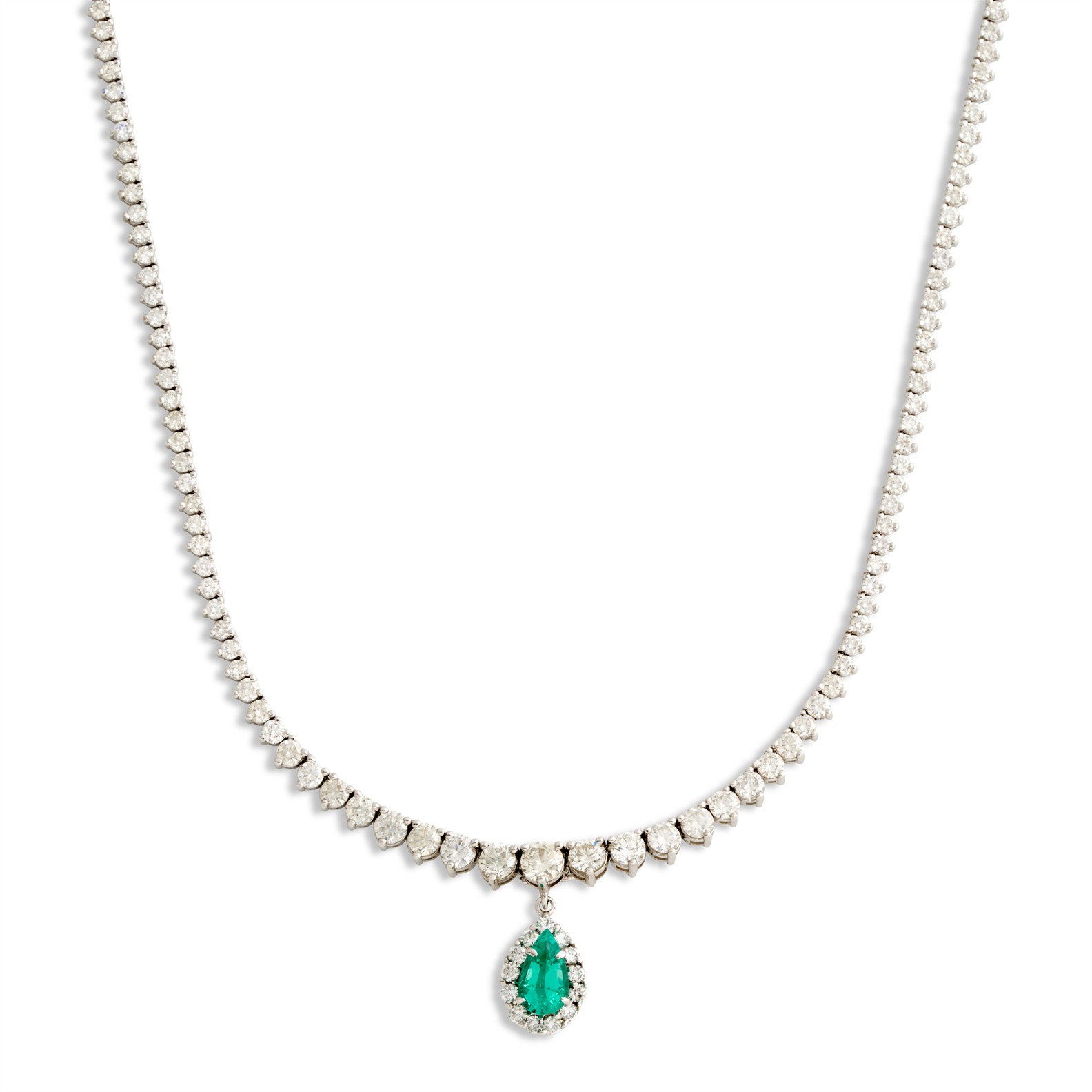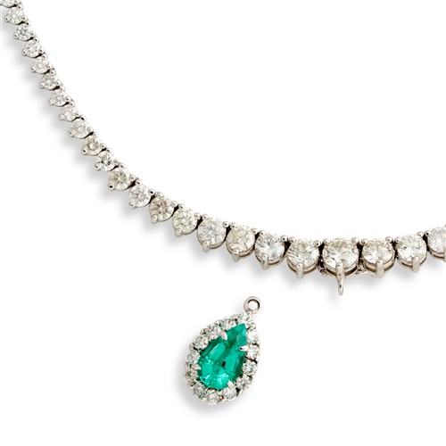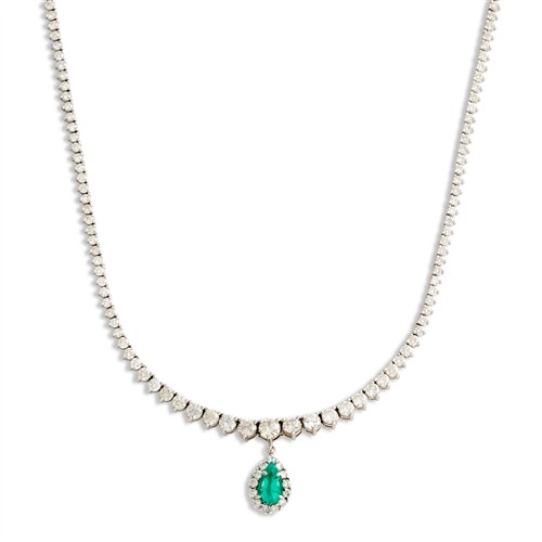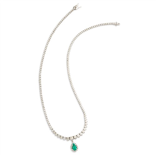 Comprising a detachable pendant of cluster design, centring a claw-set pear-cut emerald weighing approximately 1.10 carats, framed by a halo of pavé-set brilliant-cut diamonds, suspended from a graduating line of claw-set brilliant-cut diamonds, the diamonds together weighing approximately 11.13 carats, mounted in 18ct white gold, inner circumference 430mm, gross weight approximately 21.1 grams.