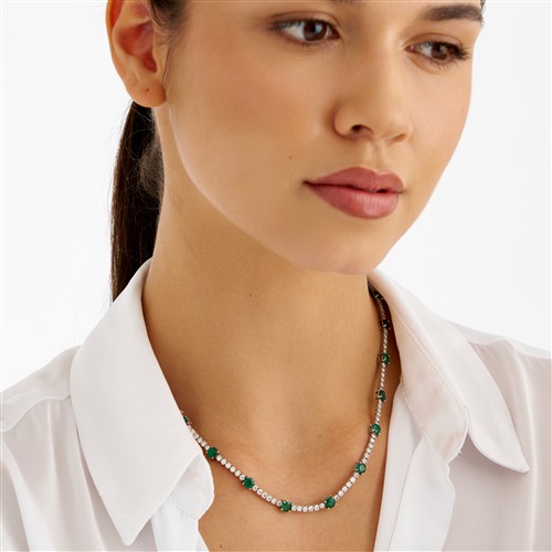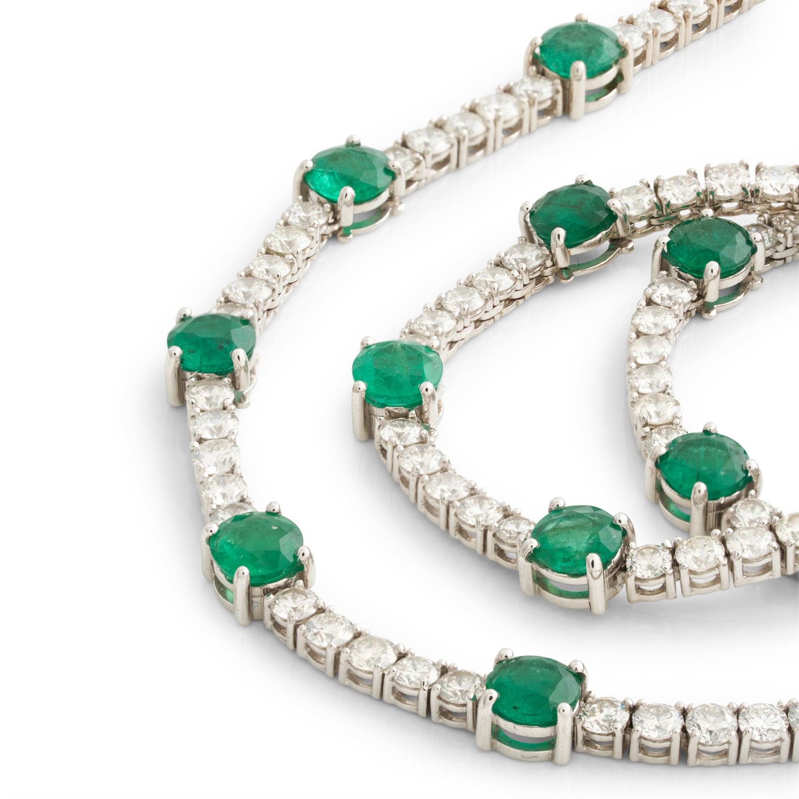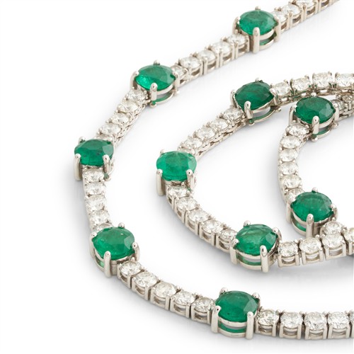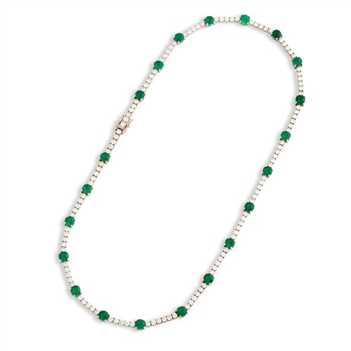 Composed as a line of claw-set brilliant-cut diamonds, the diamonds together weighing approximately 10.20 carats, interspersed by claw-set circular-cut emeralds together weighing approximately 11.65 carats, completed by a concealed box clasp, mounted in 18ct white gold, inner circumference 430mm, gross weight approximately 22.6 grams.