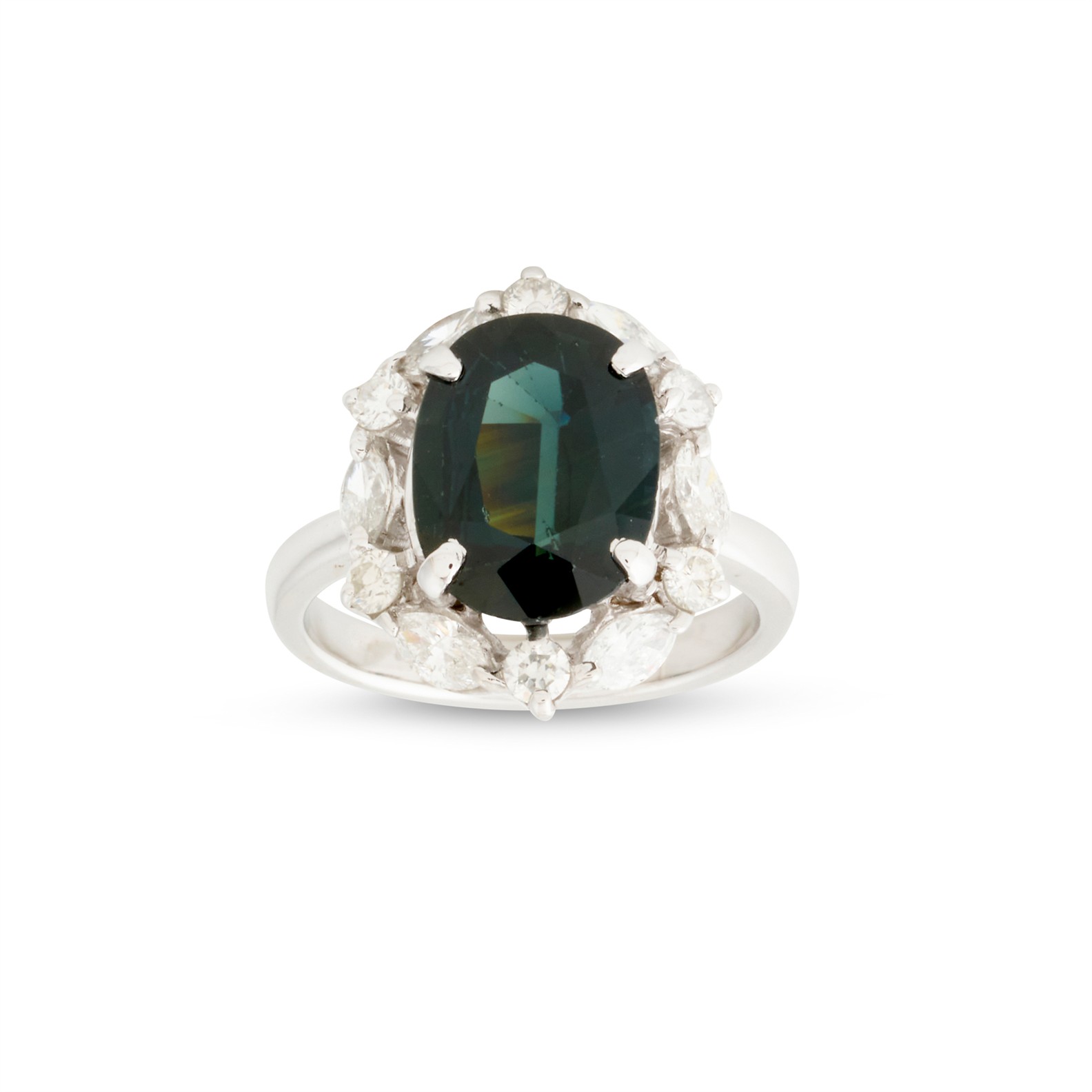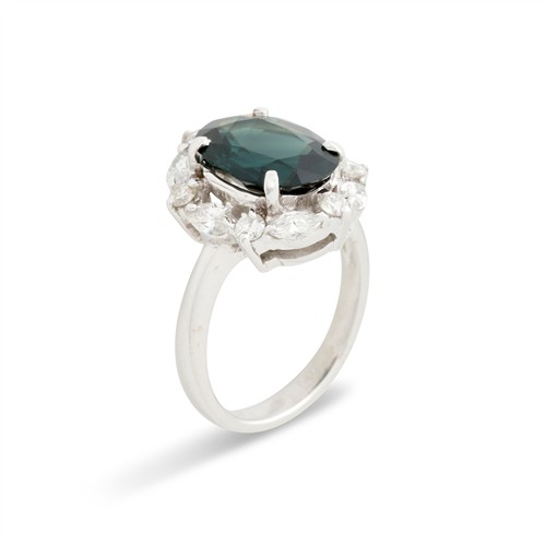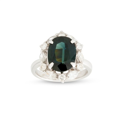 Of cluster design, centring a claw-set oval green sapphire weighing approximately 4.71 carats, framed by a halo of claw-set marquise and brilliant-cut diamonds, the diamonds together weighing approximately 1.28 carats, mounted in 18ct white gold, size M1/2, gross weight approximately 7.2 grams.