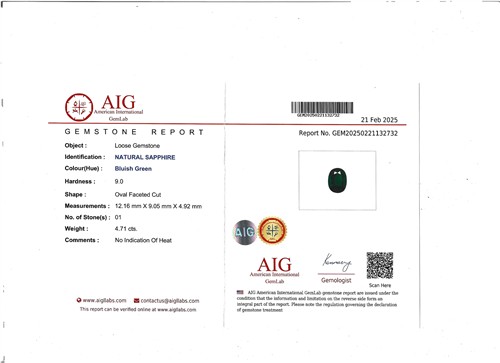 Accompanied by a facsimile GEM report numbered GEM20250221132732 dated 21 February 2025, stating that the 4.71 carat sapphire is natural and bluish-green in colour with no indication of heating.