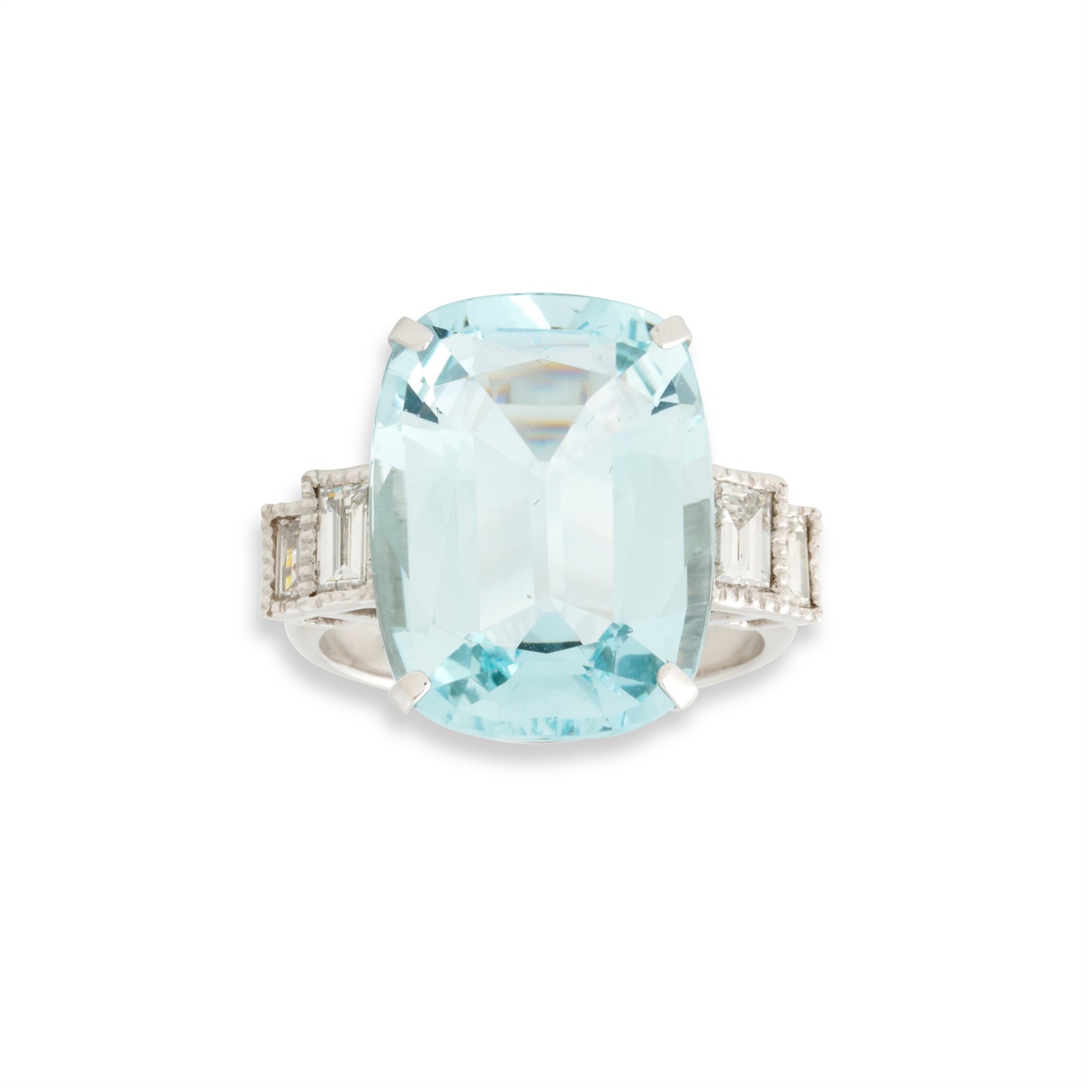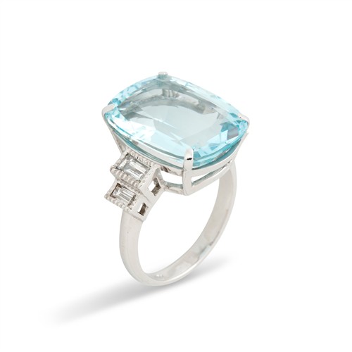 Centring a claw-set cushion-shaped aquamarine weighing approximately 11.72 carats, flanked by collet-set baguette-cut diamonds, the diamonds together weighing approximately 0.88 carats, mounted in 18ct white gold, size O, gross weight approximately 9.0 grams.