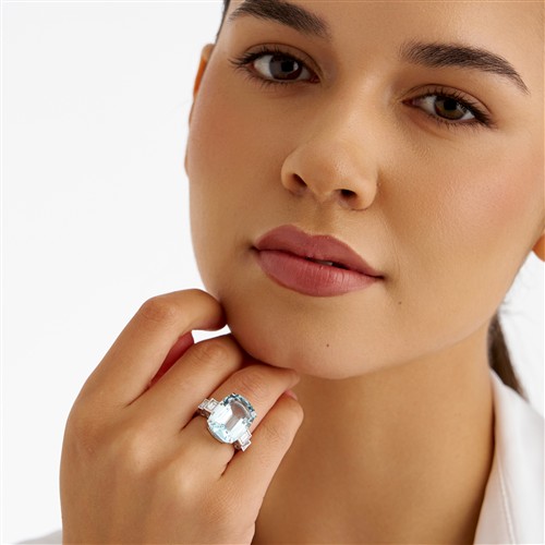 In our opinion, the aquamarine is of blue hue with light to moderate saturation, very minute nicks to facets, eye clean. The diamonds are bright and lively, probably of F colour and VS clarity, as gauged and graded within the limitations of the cutting style and the mounting.