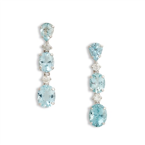 Each of drop design, comprising claw-set oval and pear-shaped aquamarines, together weighing approximately 10.30 carats, interspersed by claw-set brilliant-cut diamonds, the diamonds together weighing approximately 0.96 carats, mounted in 18ct white gold, post and scroll fittings, length 38mm, gross weight approximately 6.3 grams.