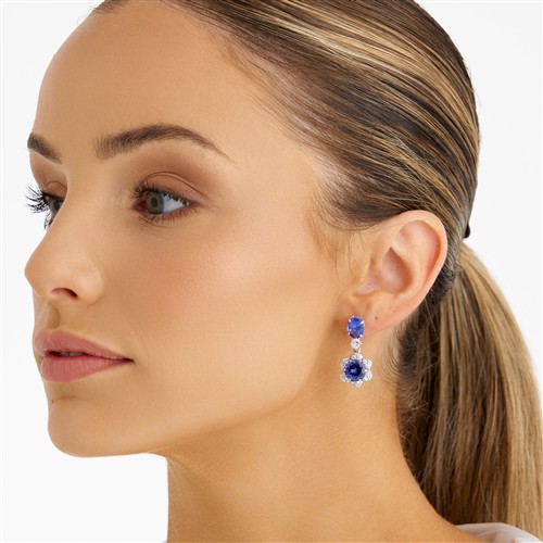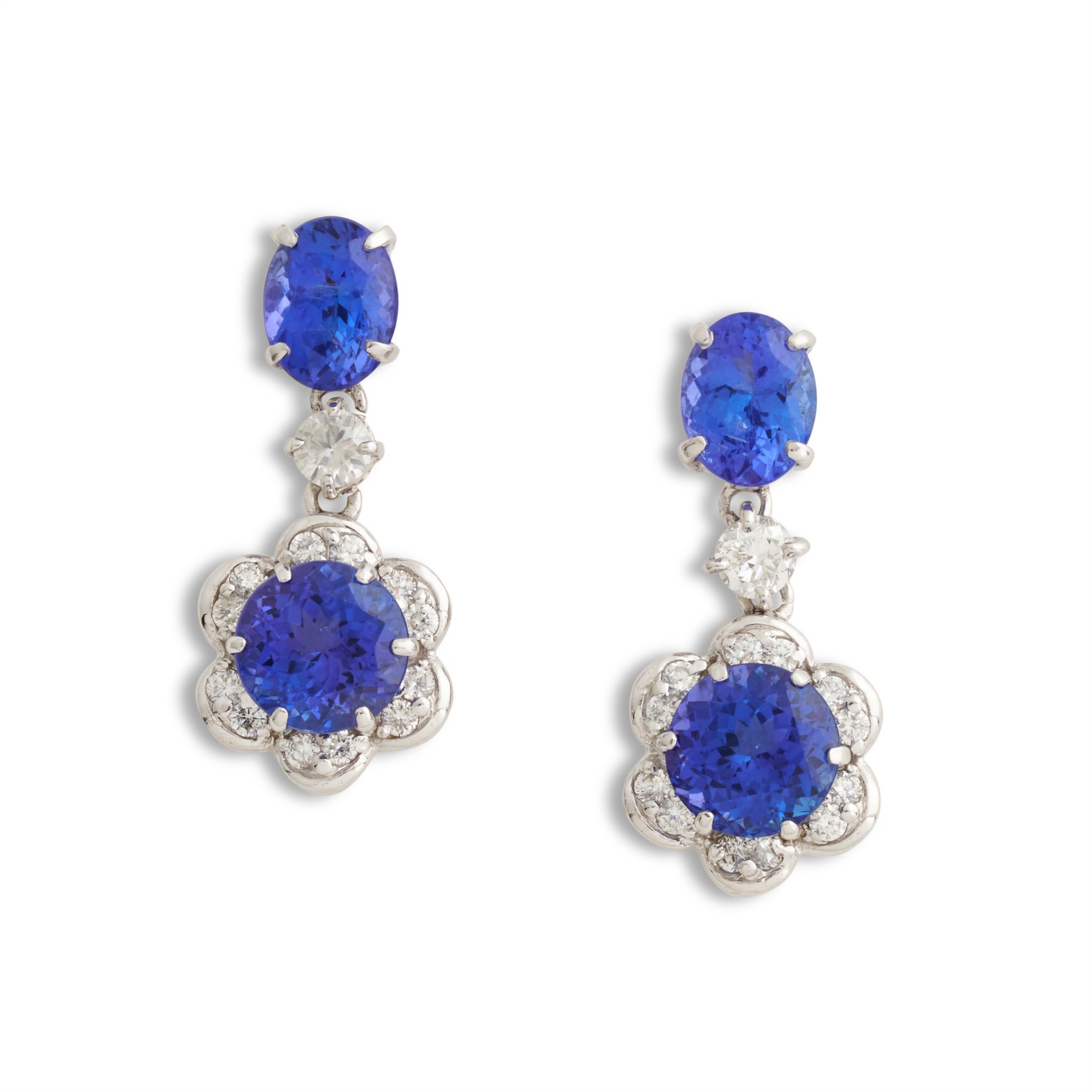Each of floral design, terminating in a claw-set circular-cut tanzanite to petals pavé-set with brilliant-cut diamonds, surmounted by a claw-set oval tanzanite between a brilliant-cut diamond connector, the tanzanites and diamonds together weighing approximately 10.80 carats and 1.18 carats respectively, mounted in 18ct white gold, length 38mm, post and scroll fittings, gross weight approximately 9.9 grams.