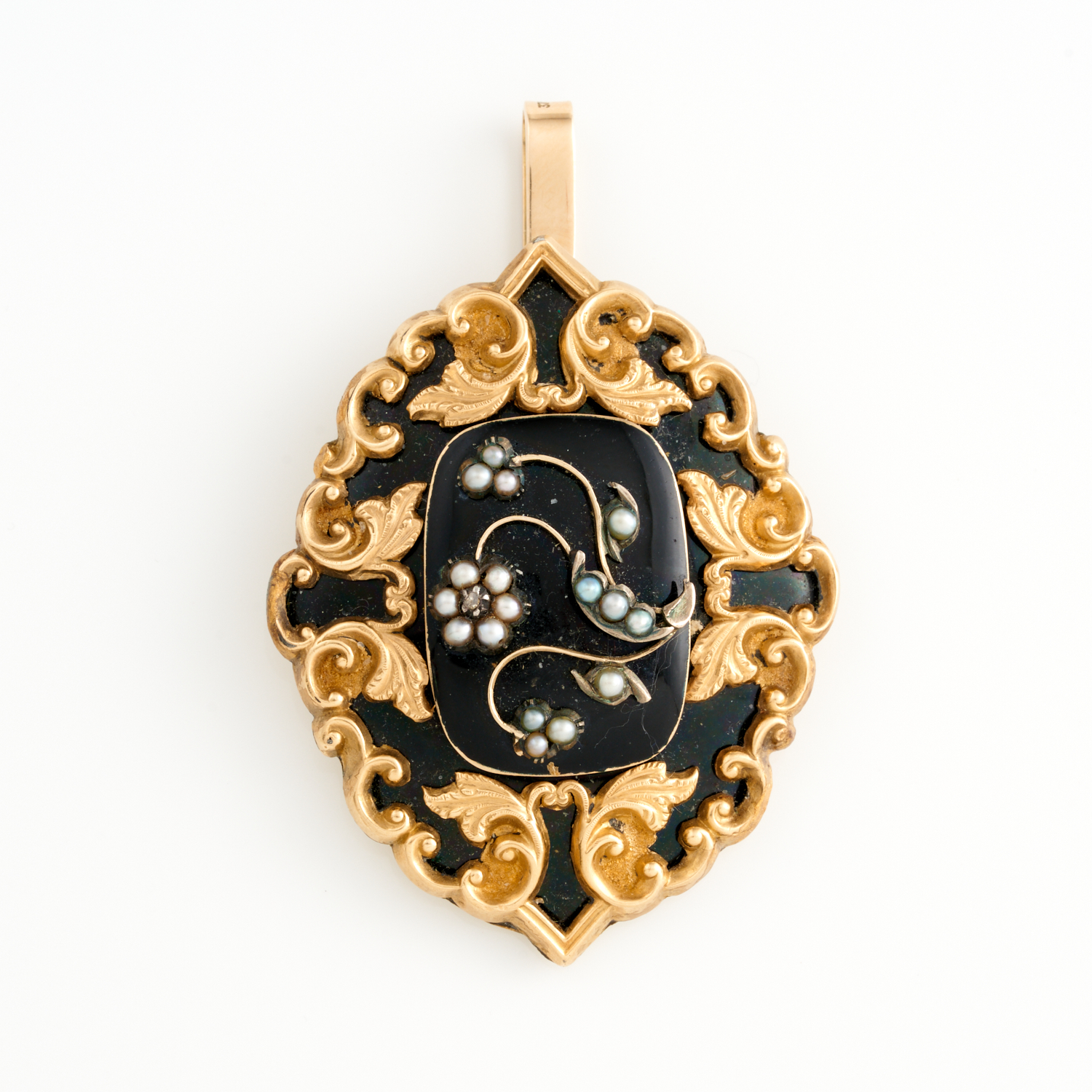 A VICTORIAN STYLE MOURNING PENDANT CASED IN 9CT GOLD WITH SEED PEARL FLORAL ACCENT, 48 X 61MM, TOTAL WEIGHT 32.27GMS