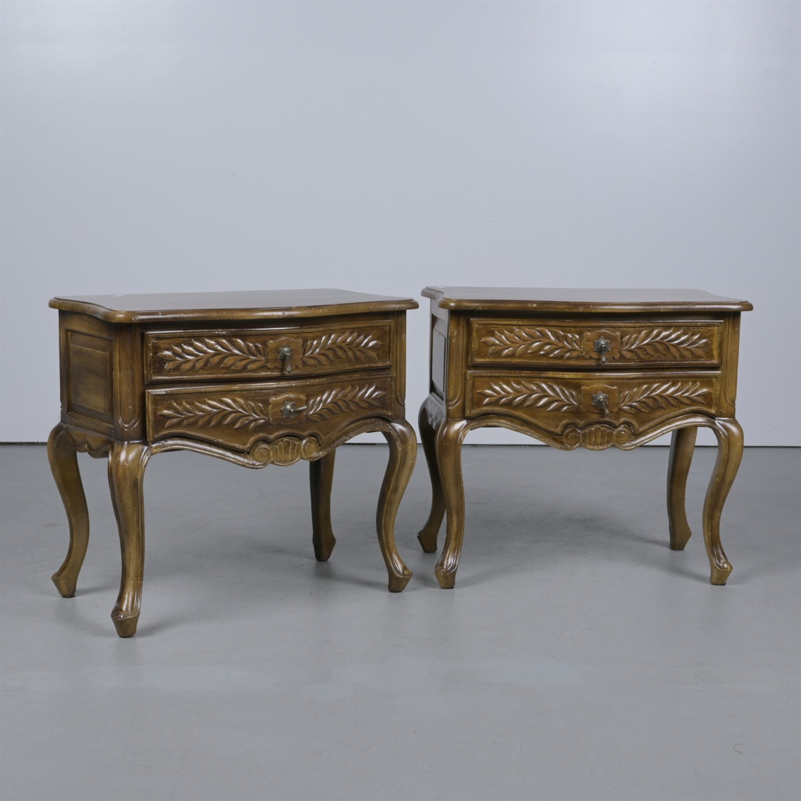 A PAIR OF HARDWOOD BEDSIDE TABLES IN ANTIQUE MANNER (74CM H X 80CM W X 51CM D)