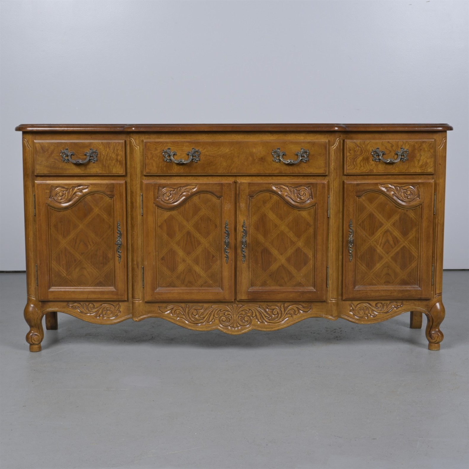 A SMALL ELM SIDEBOARD IN PROVINCIAL FRENCH MANNER (82CM H X 156CM W X 44CM D)