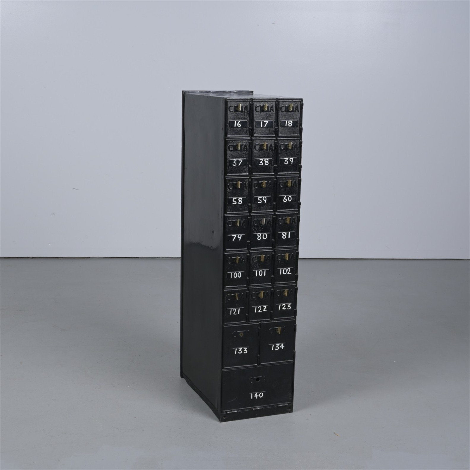 A METAL BANK OF POST OFFICE BOXES, REMOVED FROM BERRIGAN POST OFFICE (113CM H X 28CM W X 46CM D)