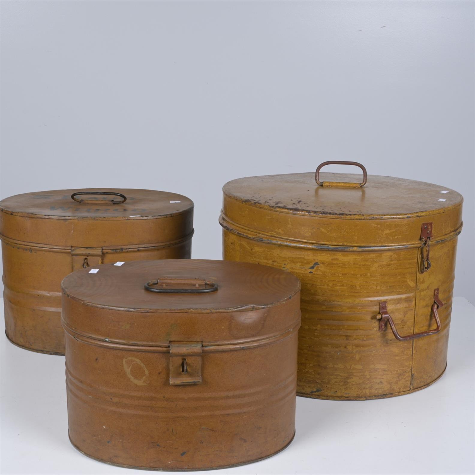 A GROUP OF THREE METAL HAT BOXES (36CM H X 46CM DIA, LARGEST)