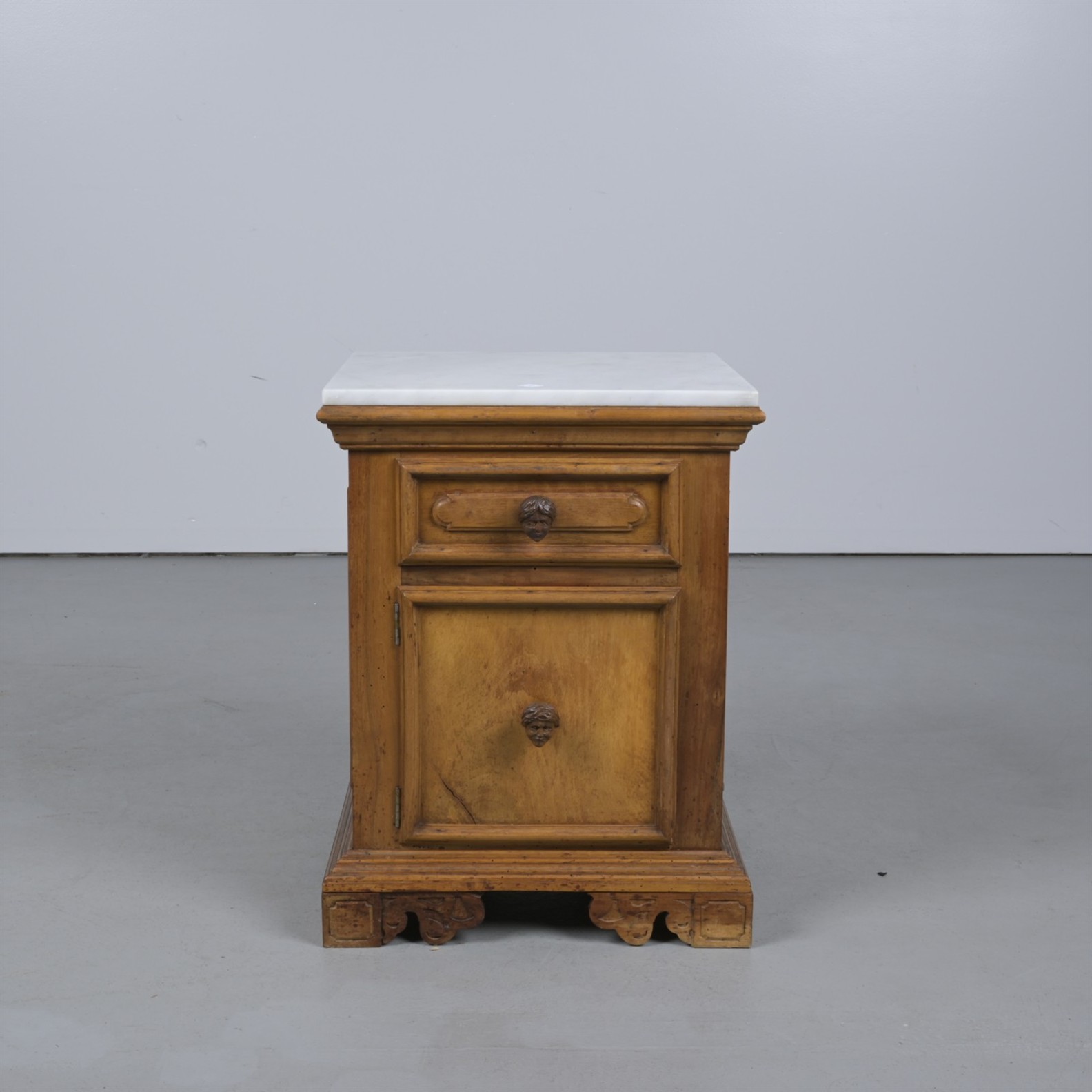 AN OAK SIDE CABINET WITH MARBLE TOP (A/F) (59CM H 52CM W X 52CM D)