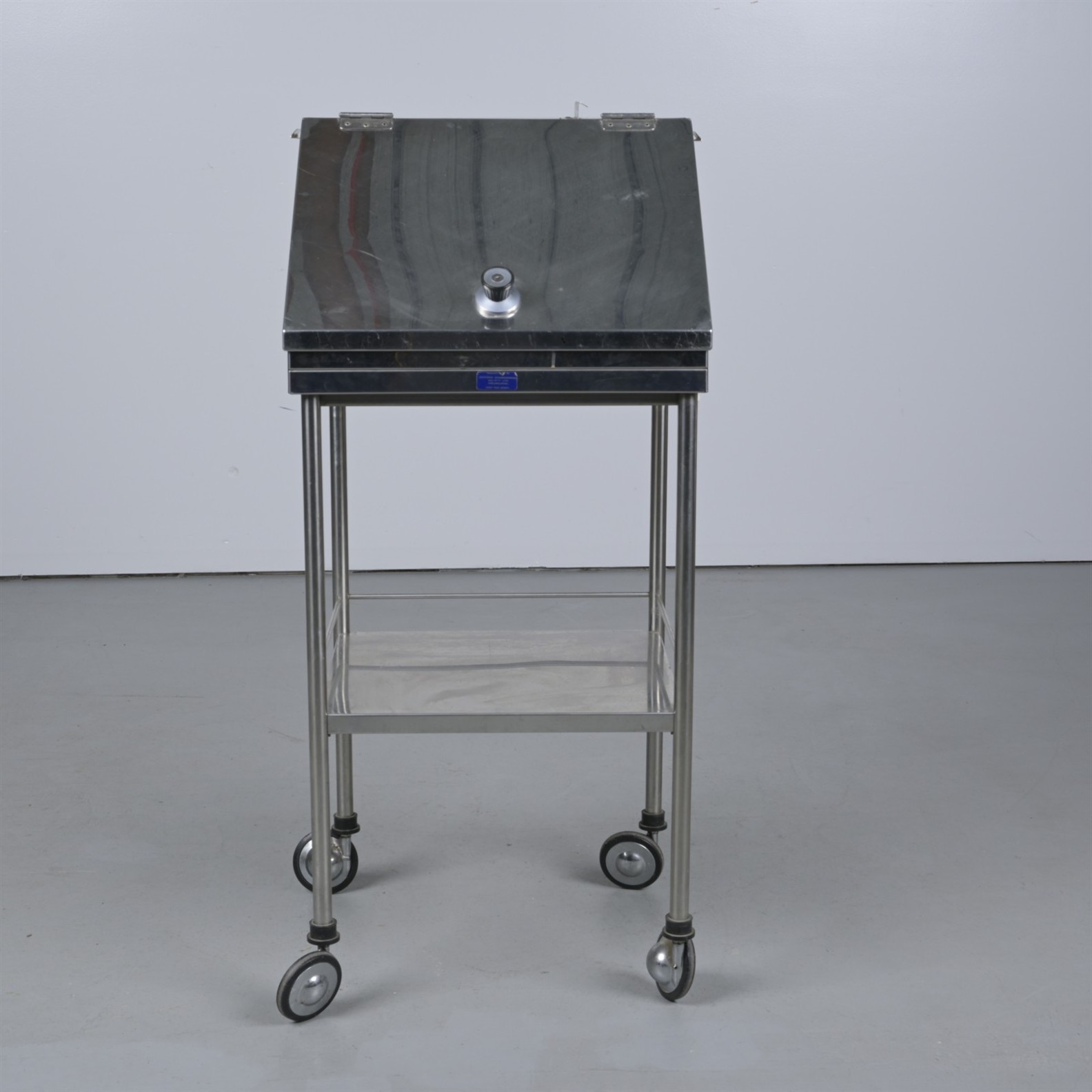 A STAINLESS STEEL CABINET WITH SIDE SHELF (A/F) (120CM H X 53CM W X 48CM D)