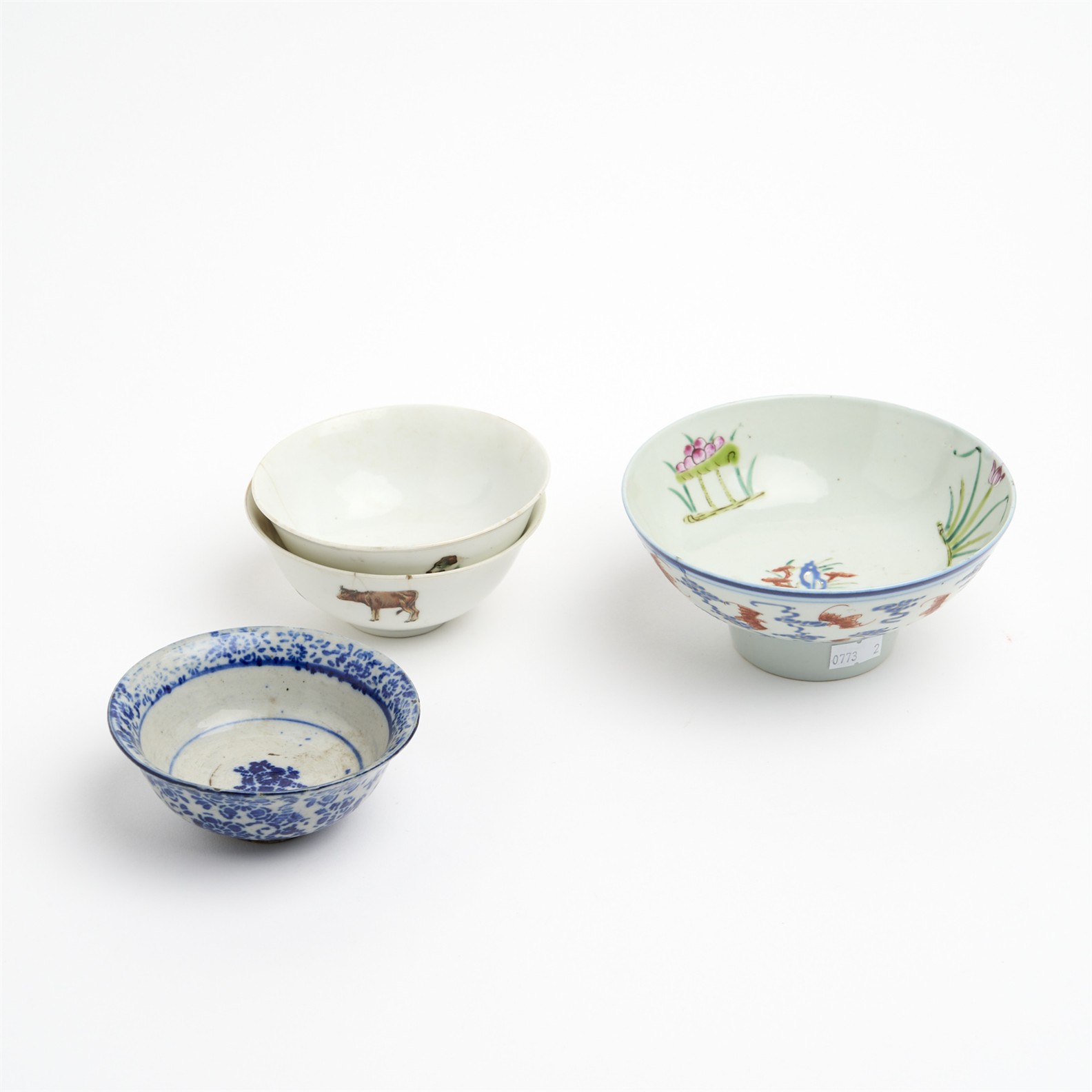 FOUR CHINESE PORCELAIN BOWLS INCLUDING THREE REPUBLIC PERIOD, AND LATE QING (A/F) DIA.14.5CM