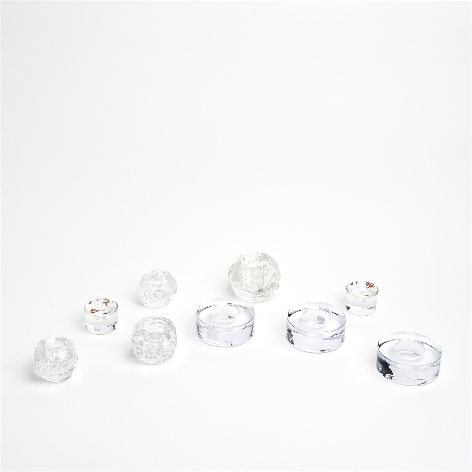 A COLLECTION OF CANDLE VOTIVES COMPRISING FOUR KOSTA BODA SNOWBALL VOTIVES BY ANN WOLFF AND FIVE ORREFORS 'PUCK' VOTIVES BY LENA BERGSTRÖM, DIA.9.5CM (LARGEST) L.9CM (LARGEST)