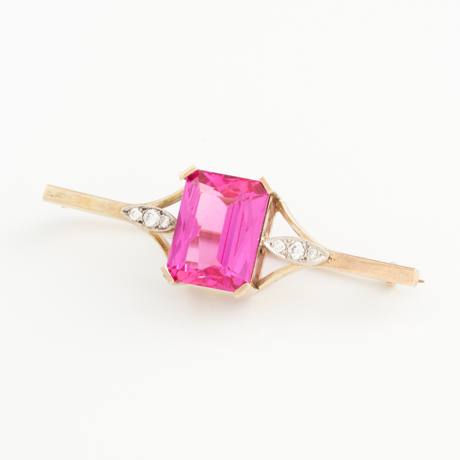 A SYNTHETIC RUBY AND CUBIC ZIRCONIA BROOCH IN 9CT TWO-TONE GOLD, 55MM, 8.85GMS