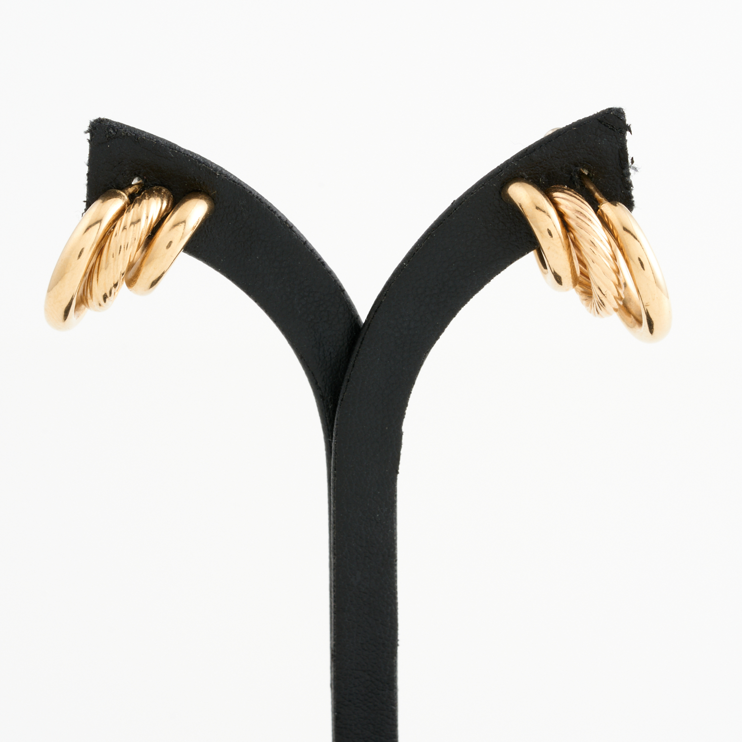 A PAIR OF TRIPLE FAUX-HOOP EARRINGS IN 9CT GOLD, TO POST AND BUTTON FITTINGS IN BASE METAL, 20MM, TOTAL WEIGHT 3.85GMS