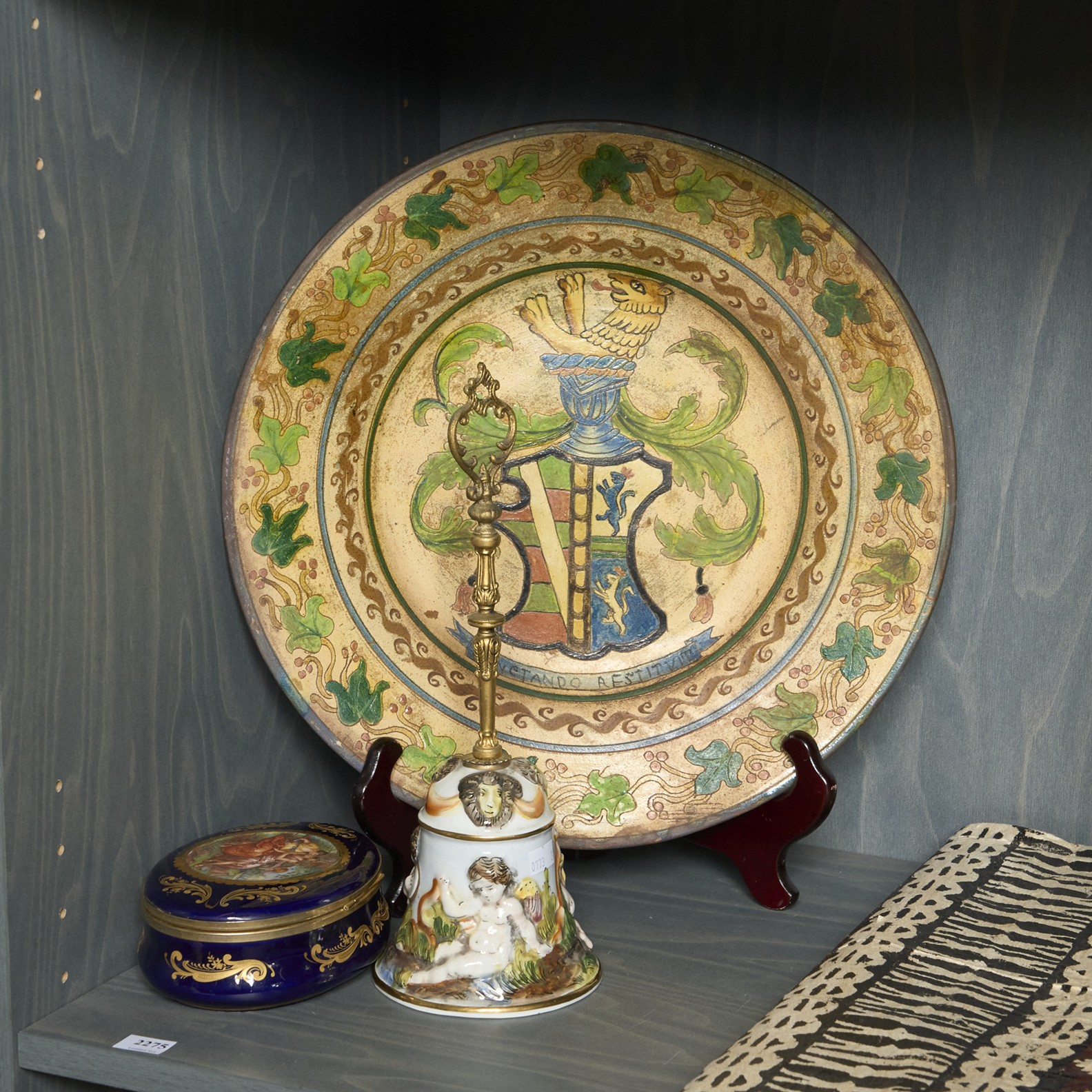 THREE PIECES OF CONTINENTAL CERAMICS INCLUDING A 19TH CENTURY ITALIAN HERALDIC POTTERY CHARGER, SIGNED GIUSEPPI NA, TOGETHER WITH A CAPODIMONTE BELL, AND A LIMOGES BOX (A/F) DIA.37.5CM (LARGEST)