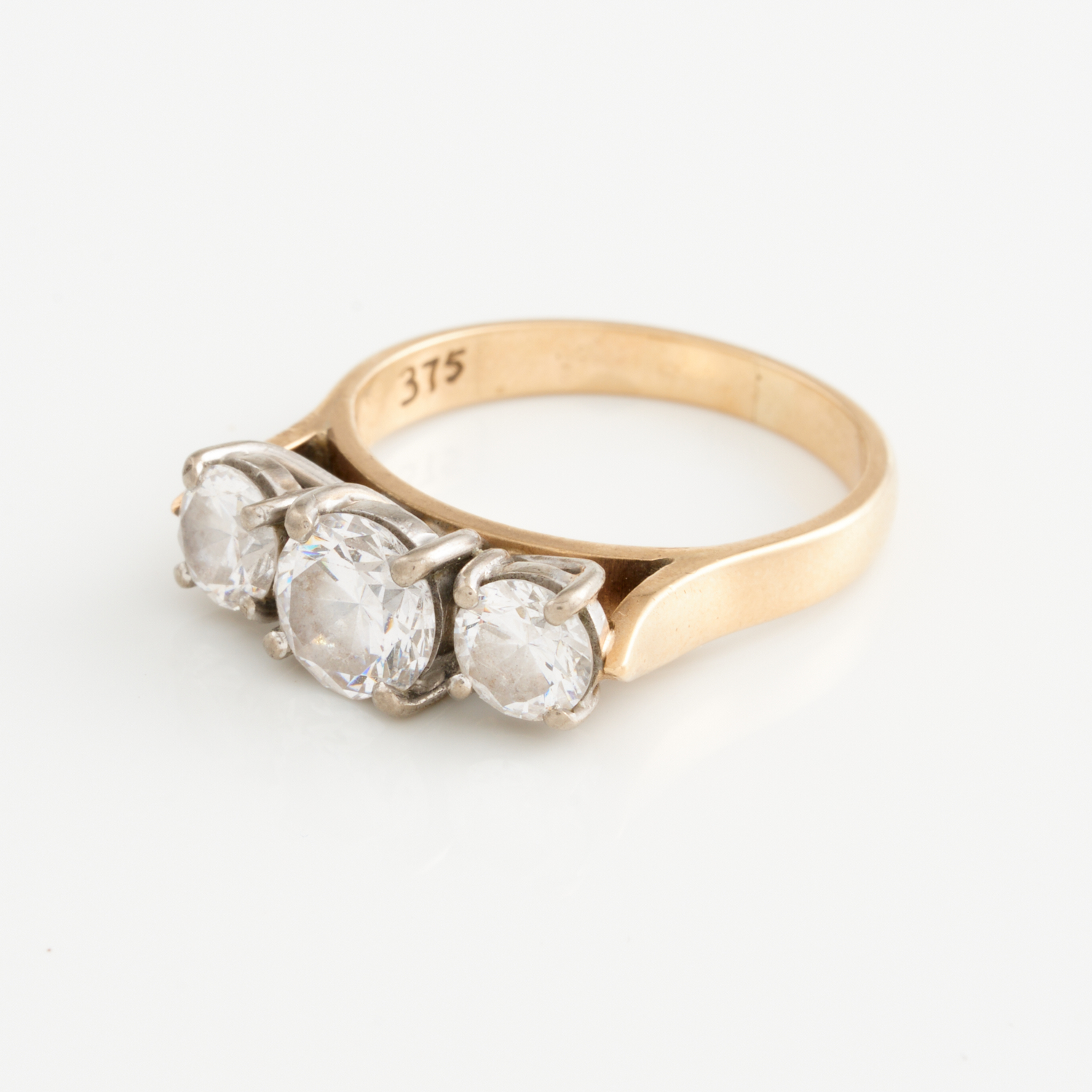 A CUBIC ZIRCONIA TRILOGY RING IN 9CT GOLD, SIZE O, TOTAL WEIGHT 5.10GMS