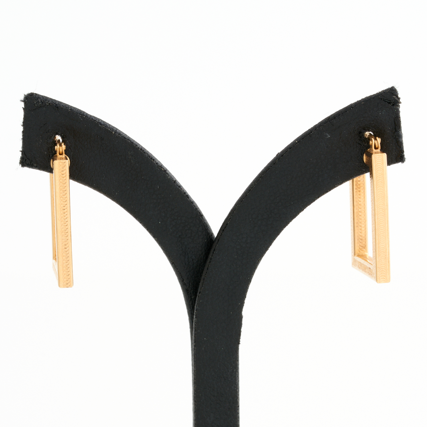 A PAIR OF RECTANGULAR HOOPS IN ENGRAVED 9CT GOLD TO POST AND CLIP FITTINGS, 10 X 20MM, TOTAL WEIGHT 2.2 GMS