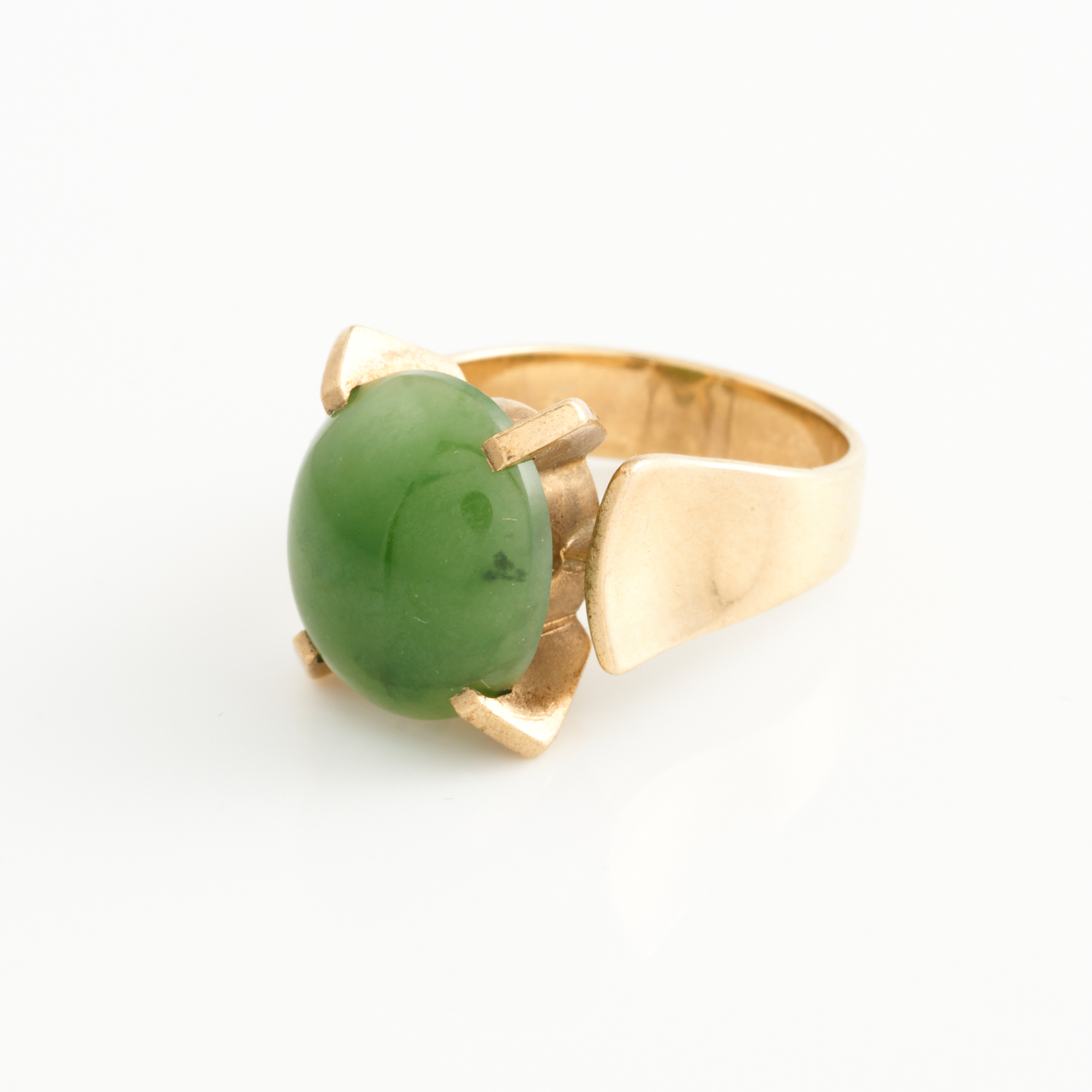 A NEPHRITE RING IN 9CT GOLD, SIZE O, WEIGHT 6.6 GMS
