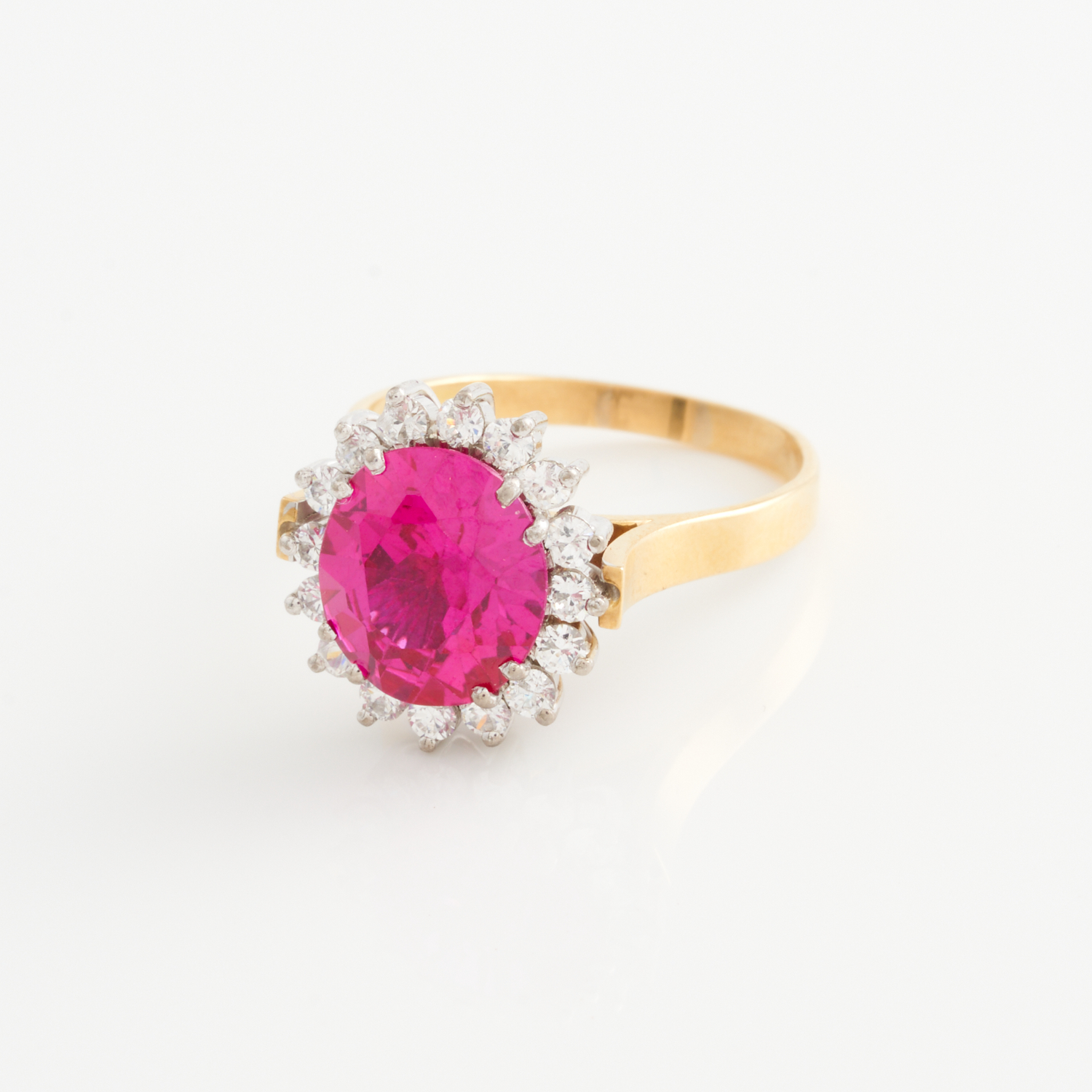 A SYNTHETIC RUBY AND CUBIC ZIRCONIA RING IN 18CT TWO TONE GOLD, Q 1/2, 5.57GMS