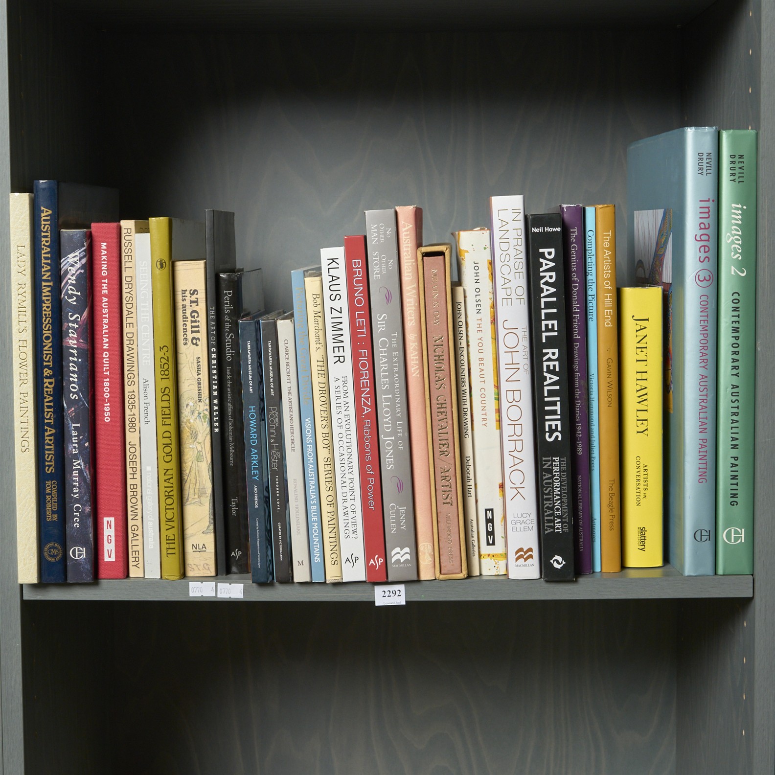 A SHELF OF AUSTRALIAN ART REFERENCE BOOKS INCLUDING OLSEN 'THE YOU BEAUT COUNTRY', LETI 'BRUNO LETI, FIORENZA', LADY RYMIILLS'S FLOWER PAINTINGS (SIGNED, LIMITED EDITION 3I6/2000), AND WILSON, THE ARTISTS OF HILL END