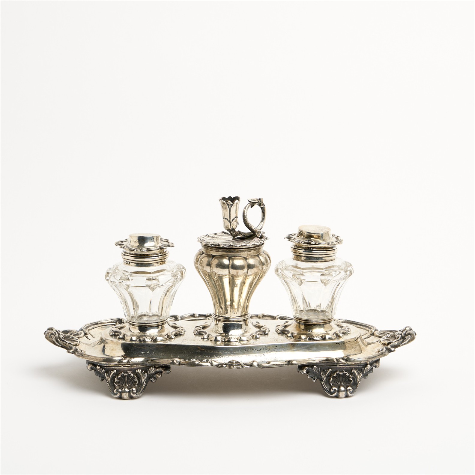 A GEORGE III STERLING SILVER DOUBLE INKWELL, 1871 W.34CM