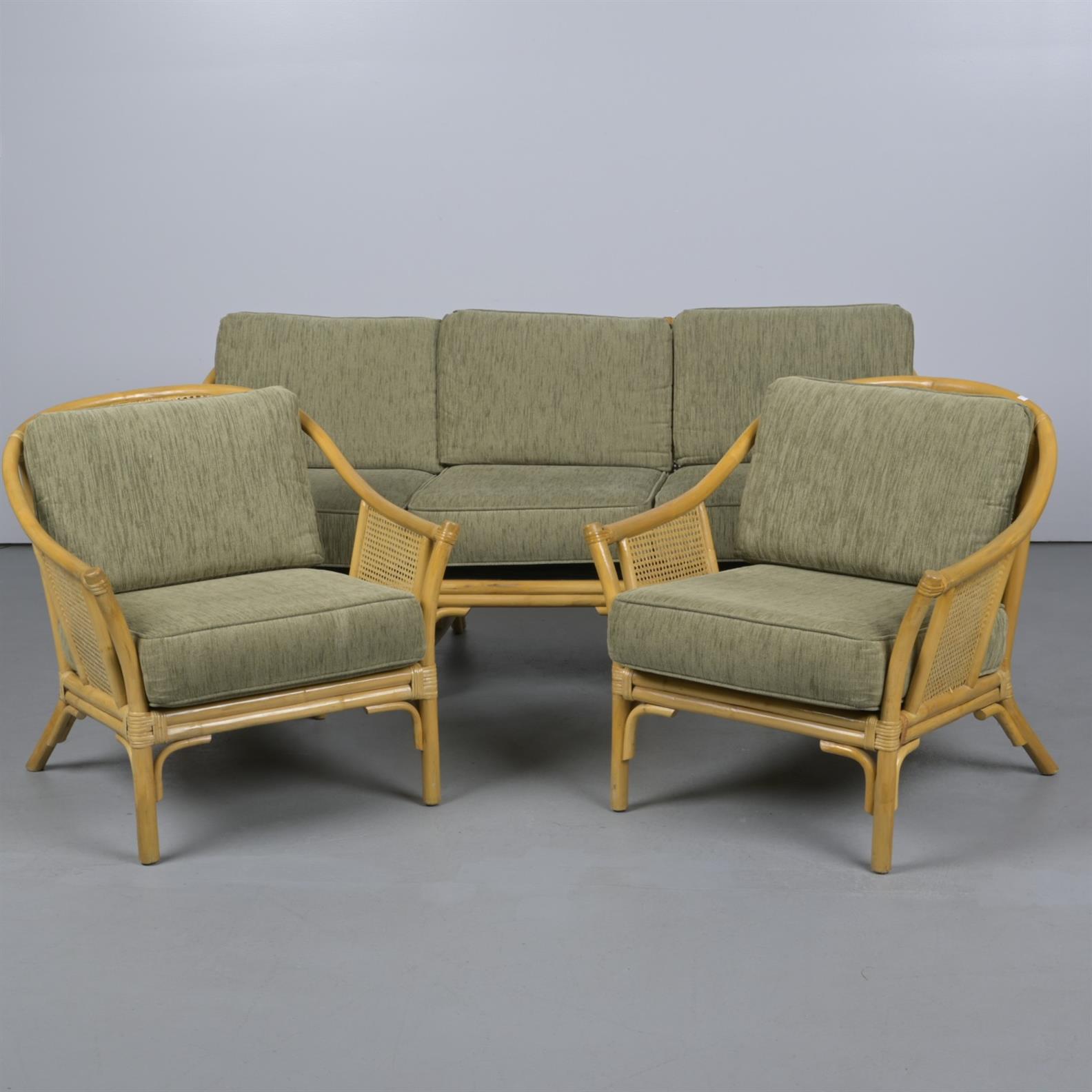 A CANE SUITE OF A SOFA AND PAIR OF ARMCHAIRS, WITH CUSHIONS (82CM H X 184CM W X 80CM D, LARGEST)