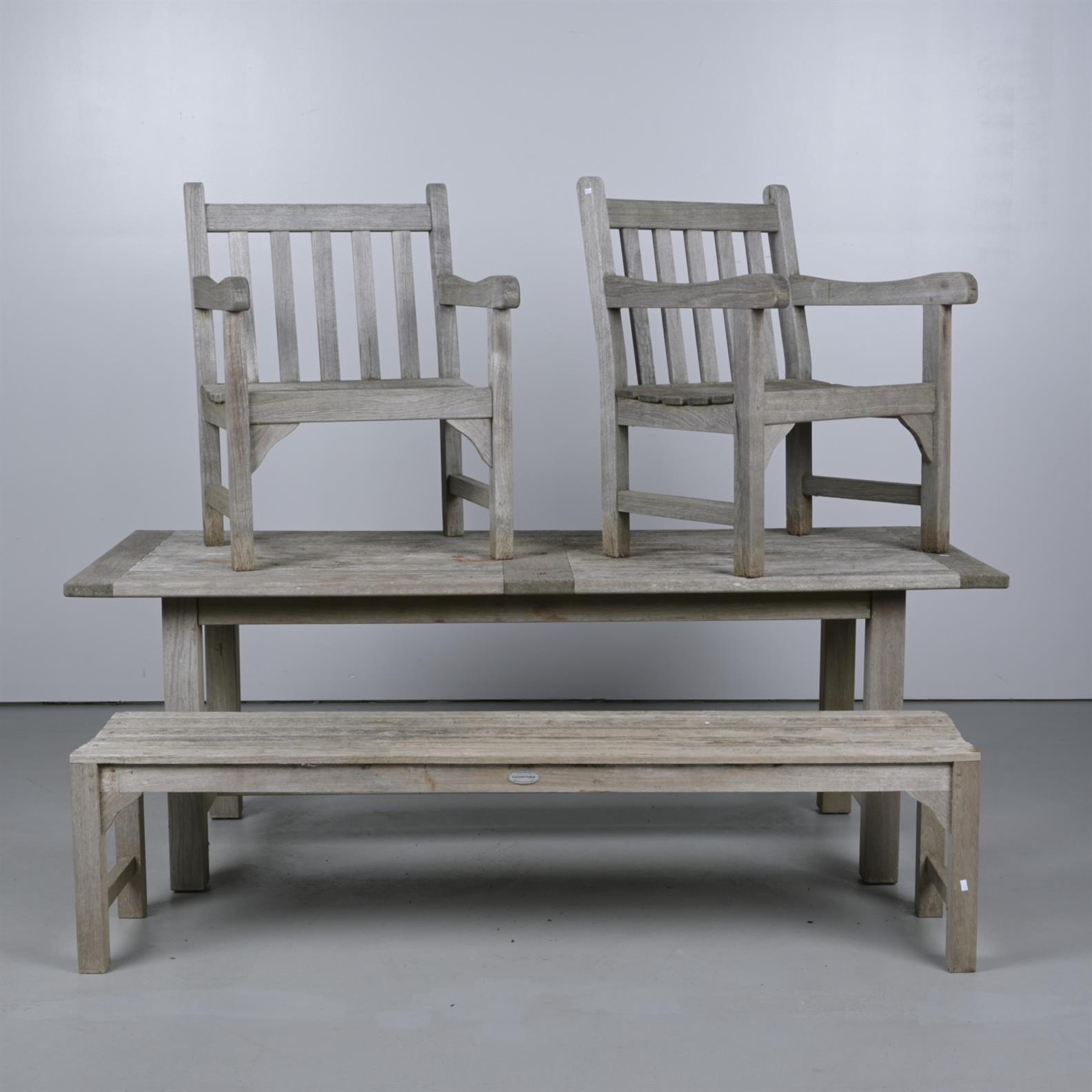 A FOUR PIECE WEATHERED TEAK OUTDOOR SETTING, COMPRISING TABLE, TWO CARVERS AND BENCH SEAT (73CM H X 206CM W X 90CM D)