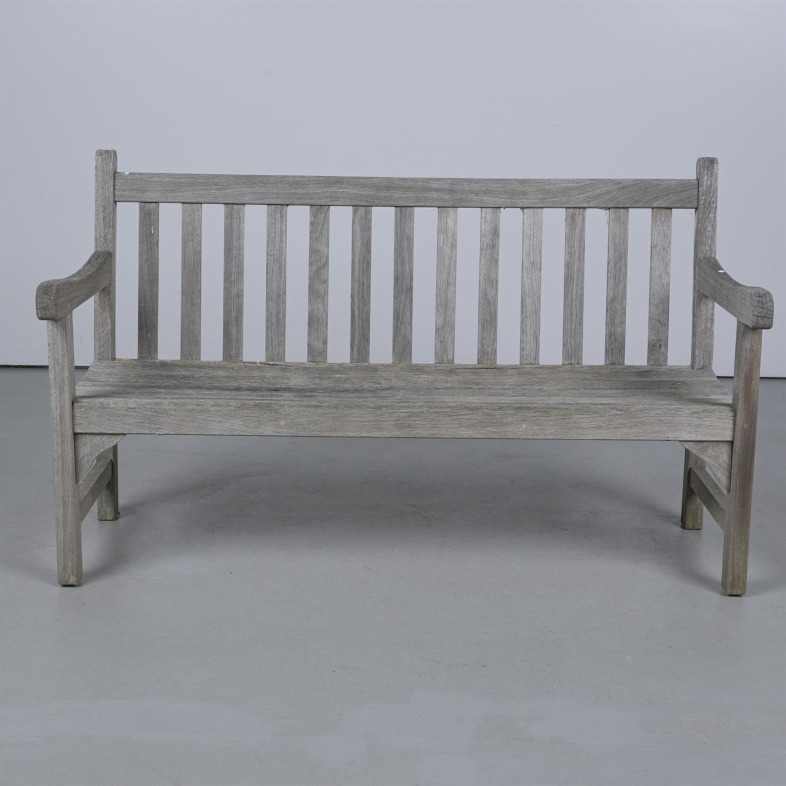 A WEATHERED TEAK BENCH SEAT BY ELMWOOD DESIGNS (A/F) (89CM H X 147CM W X 64CM D)