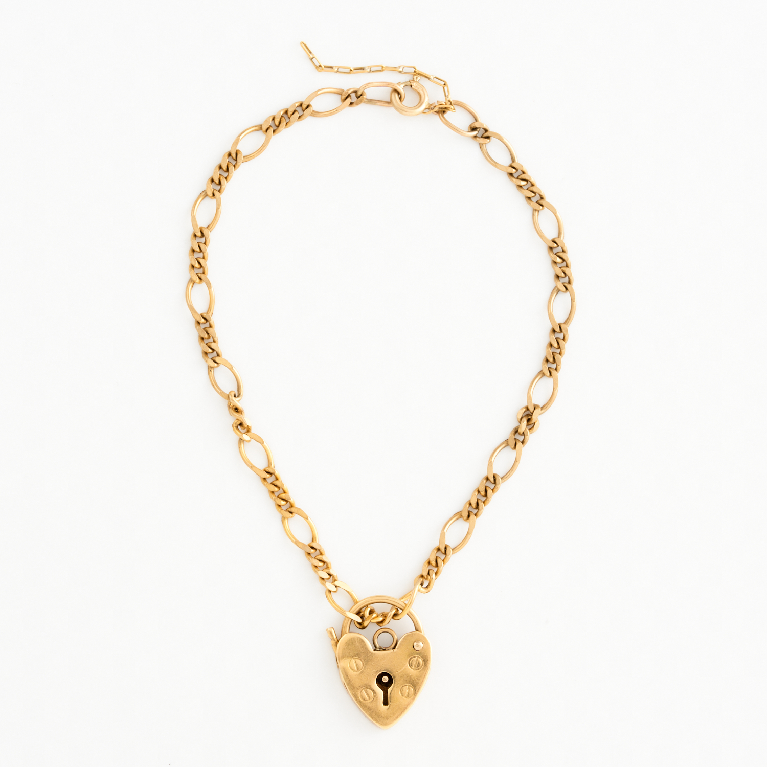 A HEART PADLOCK IN 18CT GOLD TO A CHAIN BRACELET IN 9CT GOLD, TOTAL LENGTH 200GMS, TOTAL WEIGHT 5.5GMS